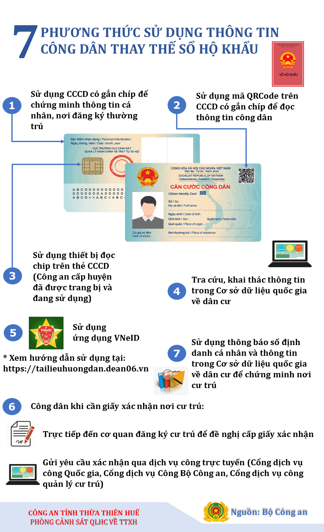 Các cơ quan, tổ chức, cá nhân thực hiện 1 trong 7 phương thức sử dụng thông tin công dân để thay thế việc xuất trình Sổ hộ khẩu, Sổ tạm trú khi thực hiện thủ tục hành chính, giao dịch dân sự như sau: Sử dụng thẻ căn cước công dân gắn chíp điện tử chứng minh thông tin về cá nhân, nơi thường trú; Sử dụng thiết bị đọc mã QRCode trên thẻ CCCD có gắn chip để đọc thông tin công dân; Sử dụng thiết bị đọc chip trên thẻ CCCD; Tra cứu, khai thác thông tin cá nhân trực tuyến trong Cơ sở dữ liệu Quốc gia về dân cư; Tra cứu, khai thác thông tin cá nhân trực tuyến trong Cơ sở dữ liệu Quốc gia về dân cư; Sử dụng ứng dụng VneID hiển thị các thông tin trên các thiết bị điện tử để phục vụ giải quyết các thủ tục hành chính, giao dịch dân sự; Sử dụng giấy xác nhận thông tin về cư trú; Sử dụng Thông báo số định danh cá nhân và thông tin trong Cơ sở dữ liệu Quốc gia về dân cư.