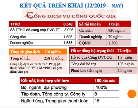 Riêng Cổng Dịch vụ công quốc gia, từ tháng 12/2019 đến nay đã cung cấp 3.096 dịch vụ công trực tuyến (trong đó có 1696 dịch vụ công cho công dân; 1.688 dịch vụ công cho doanh nghiệp); có trên 1 triệu tài khoản đăng ký; số hồ sơ đồng bộ trạng thái là 72 triệu hồ sơ. Đến nay đã có 100% Bộ, ngành, địa phương; 8 Tập đoàn, Tổng công ty, công ty; 15 Ngân hàng, trung gian thành toán kết nối với Cổng Dịch vụ công quốc gia. Số giao dịch trên Cổng là 116.000 với tổng số tiền 258 tỷ đồng cho các dịch vụ thanh toán: Phí, lệ phí, BHXH, BHYT, án phí...