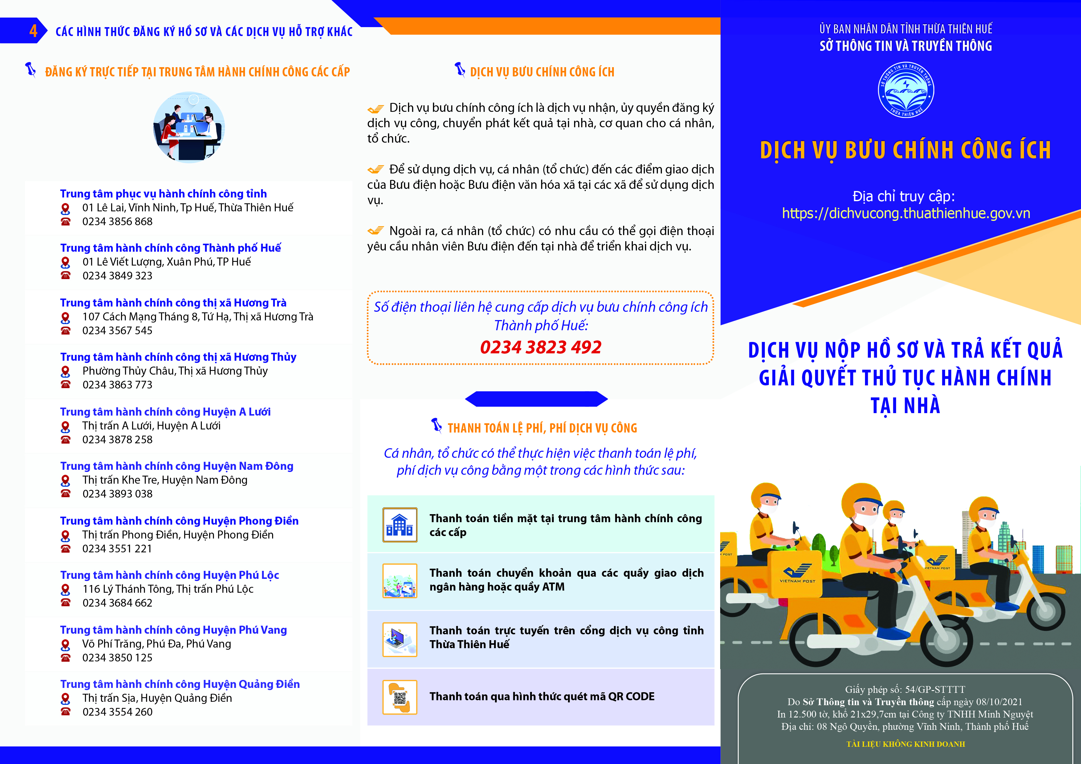 Bước 1: Cá nhân, tổ chức, doanh nghiệp đăng ký tiếp nhận và trả kết quả hồ sơ qua dịch vụ công ích Bưu điện huyện hoặc xã (nơi gần nhất) hoặc tại địa chỉ nhà cá nhân, tổ chức, doanh nghiệp theo yêu cầu.