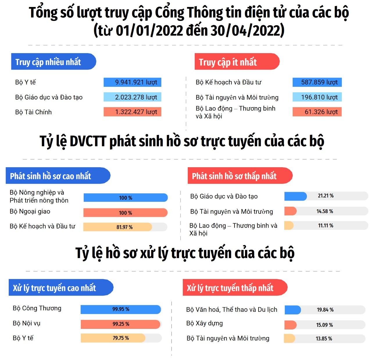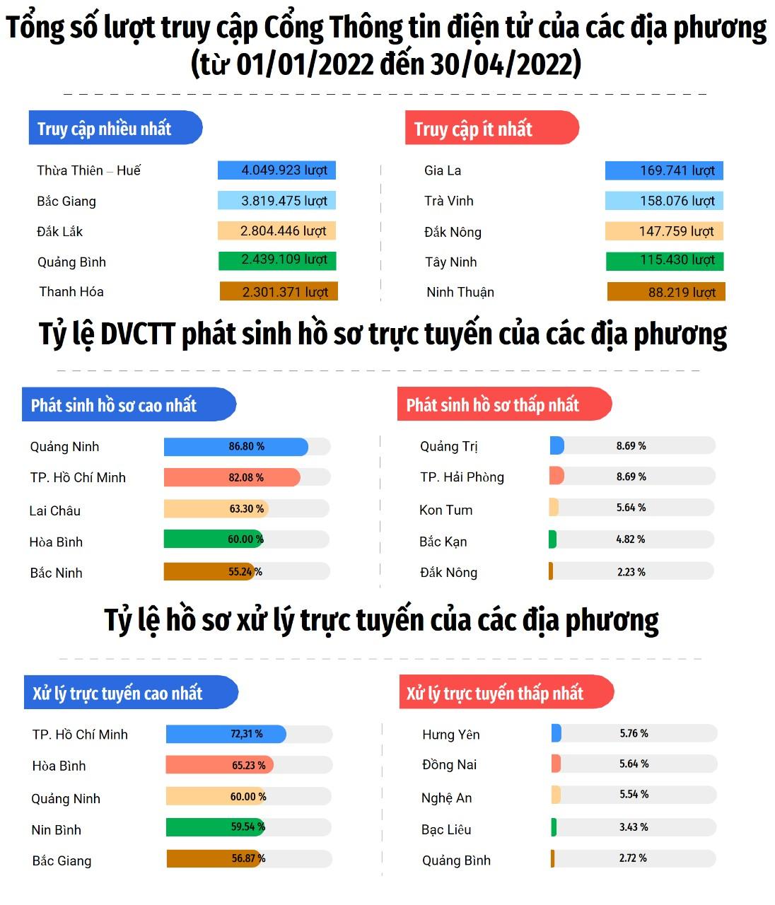 Mặc dù đã đạt được những kết quả rất quan trọng, tuy nhiên hiệu quả sử dụng DVCTT chưa cao, số lượng hồ sơ được xử lý trực tuyến còn hạn chế. Tính đến tháng 4/2022, tỷ lệ hồ sơ trực tuyến trung bình đạt 24,89%. Để cụ thể hơn, báo cáo cung cấp các chỉ số được thực hiện một cách tự động, theo thời gian thực bởi Hệ thống giám sát, đo lường của Bộ Thông tin và Truyền thông.