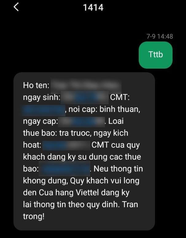 Ảnh minh họa kết quả tra cứu thông tin thuê bao điện thoại bằng tin nhắn.
