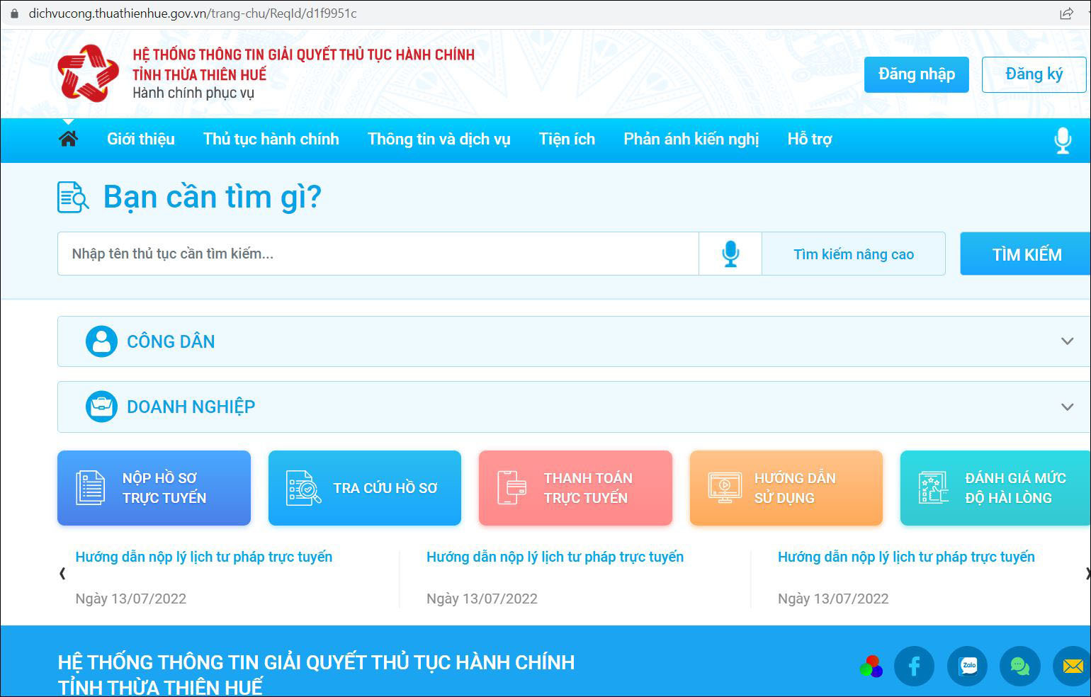 Theo danh mục mới vừa được UBND tỉnh Thừa Thiên Huế ban hành, trên cổng thông tin giải quyết thủ tục hành chính của tỉnh tại địa chỉ dichvucong.thuathienhue.gov.vn, người dân và doanh nghiệp có thể sử dụng 1.159 dịch vụ cấp sở, ban, ngành; 150 dịch vụ cấp huyện; 50 dịch vụ cấp xã ở nhiều lĩnh vực khác nhau như hộ tịch, giáo dục, y tế, công thương...