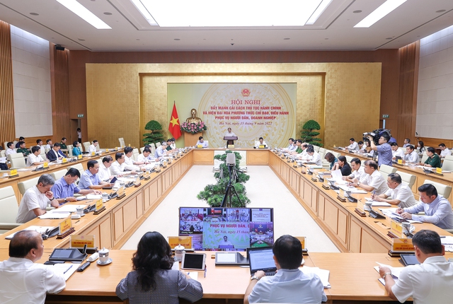 Sáng 15/9, Thủ tướng Phạm Minh Chính chủ trì Hội nghị chuyên đề về đẩy mạnh cải cách thủ tục hành chính (TTHC) và hiện đại hóa phương thức chỉ đạo, điều hành phục vụ người dân, doanh nghiệp. Hội nghị do VPCP tổ chức, được kết nối trực tuyến từ Trụ sở Chính phủ tới trụ sở UBND các tỉnh, thành phố trực thuộc Trung ương, các quận, huyện, thị xã trên toàn quốc. Tại hội nghị, Bộ trưởng, Chủ nhiệm VPCP Trần Văn Sơn đã trình bày báo cáo tóm tắt về công tác cải cách TTHC và hiện đại hóa phương thức chỉ đạo, điều hành phục vụ người dân, doanh nghiệp năm 2021 và 8 tháng năm 2022; đề xuất một số nhiệm vụ, giải pháp trọng tâm giai đoạn 2022-2025.