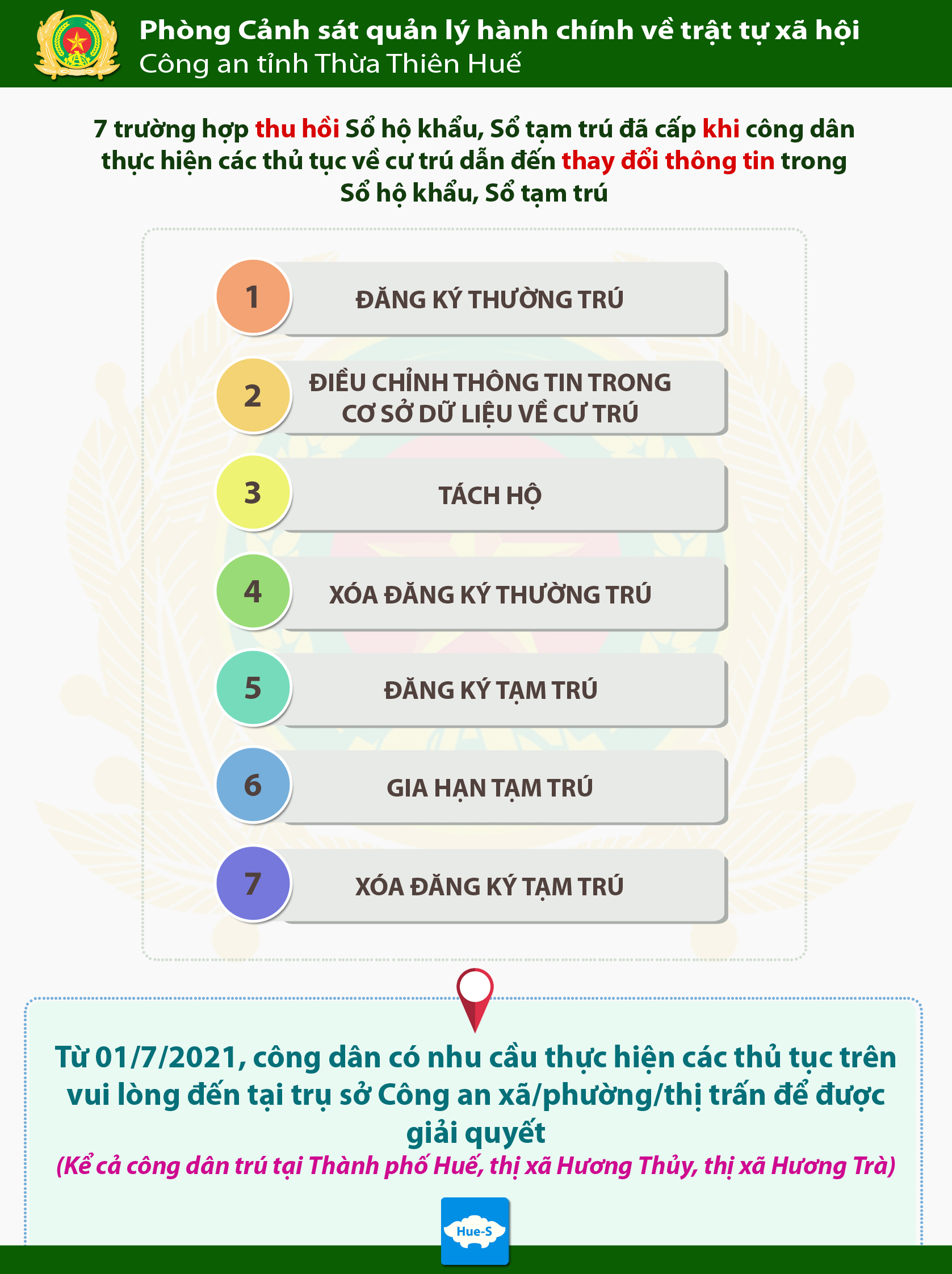 Cũng từ 01/7/2021, Công dân có nhu cầu thực hiện các thủ tục trên có thể thực hiện tại Trụ sở Công an xã/phường/thị trấn để được giải quyết (kể cả công dân trú tại Thành phố Huế, thị xã Hương Thủy, thị xã Hương Trà)