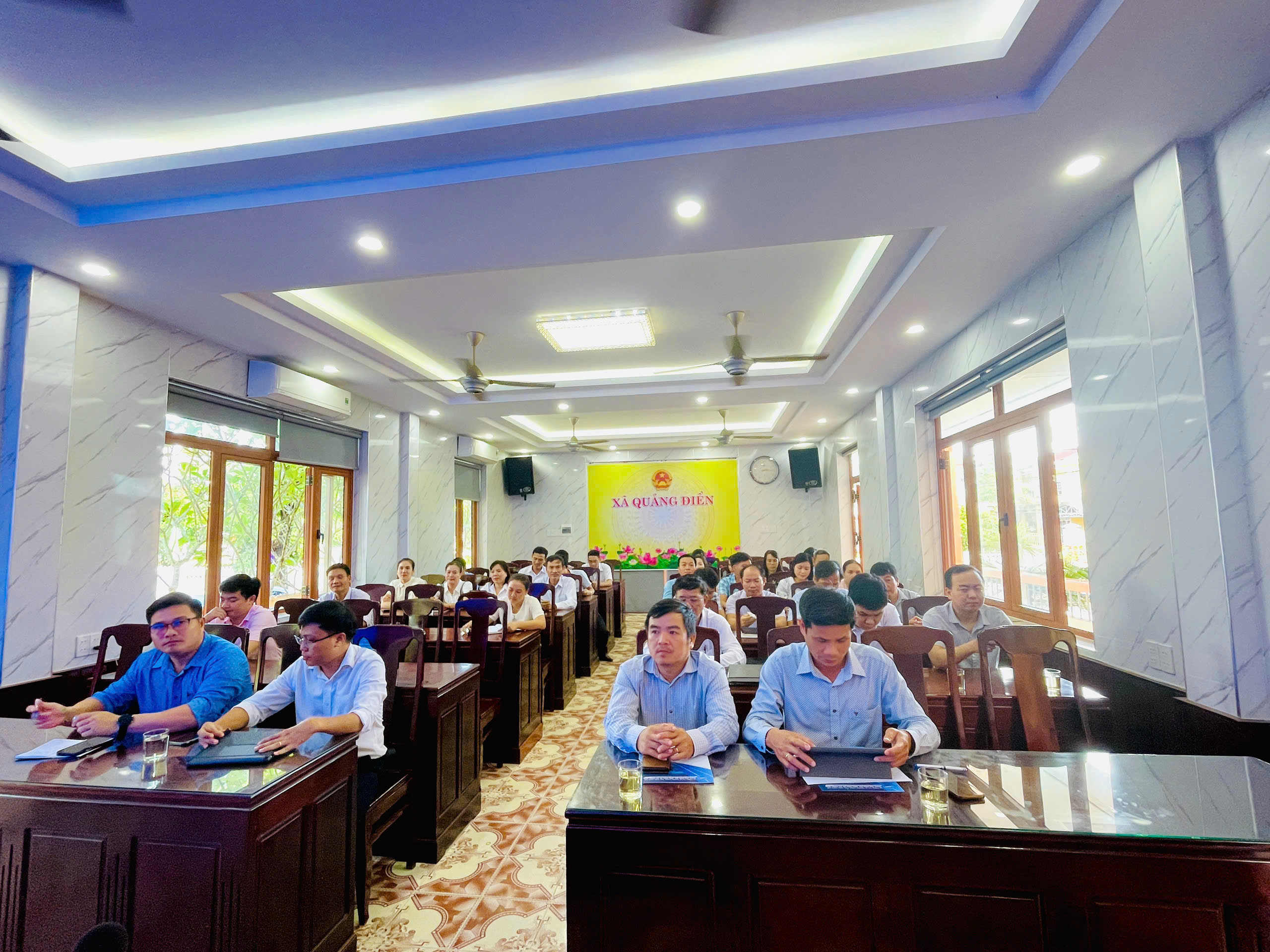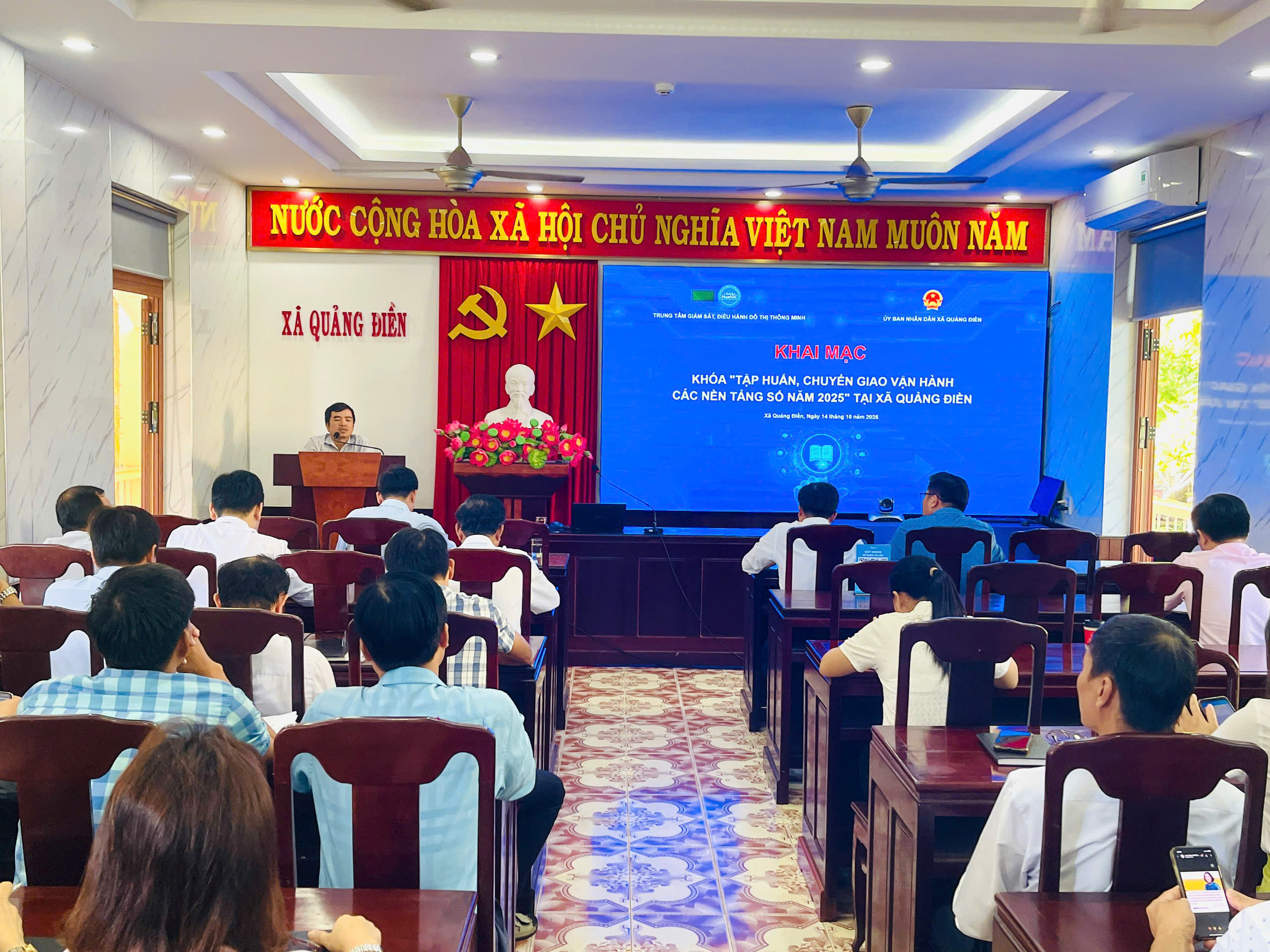 Tham gia buổi tập huấn về phía xã Quảng Điền có đồng chí Trần Kìm – Phó chủ tịch UBND; đồng chí Nguyễn Duẫn – Chánh Văn phòng HĐND-UBND xã và toàn thể học viên là đội ngũ CBCCVC của xã Quảng Điền, về phía Trung tâm HueIOC có đồng chí Hồ Văn An – Trưởng phòng HCDV Trung tâm cùng các chuyên gia, giảng viên của Trung tâm.