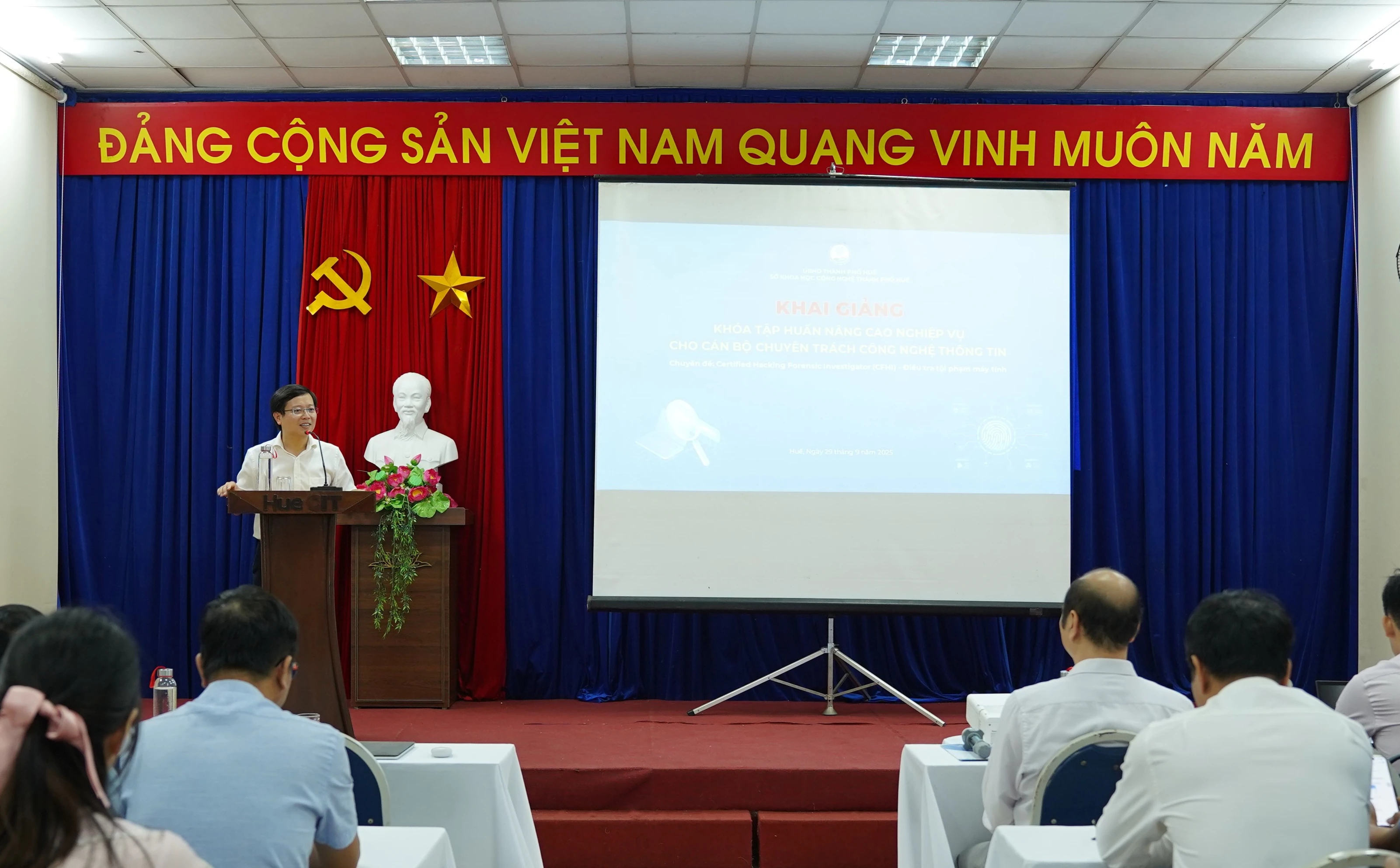 Ngày 29/9/2025, Trung tâm Giám sát, điều hành đô thị thông minh (HueIOC) thuộc Sở Khoa học và Công nghệ (KH&CN) thành phố Huế tổ chức Khai giảng Lớp tập huấn Nâng cao nghiệp vụ cho cán bộ chuyên trách Công nghệ thông tin (CNTT) năm 2025 - Chuyên đề Certified Hacking Forensic Investigator (CHFI) - Điều tra tội phạm máy tính.