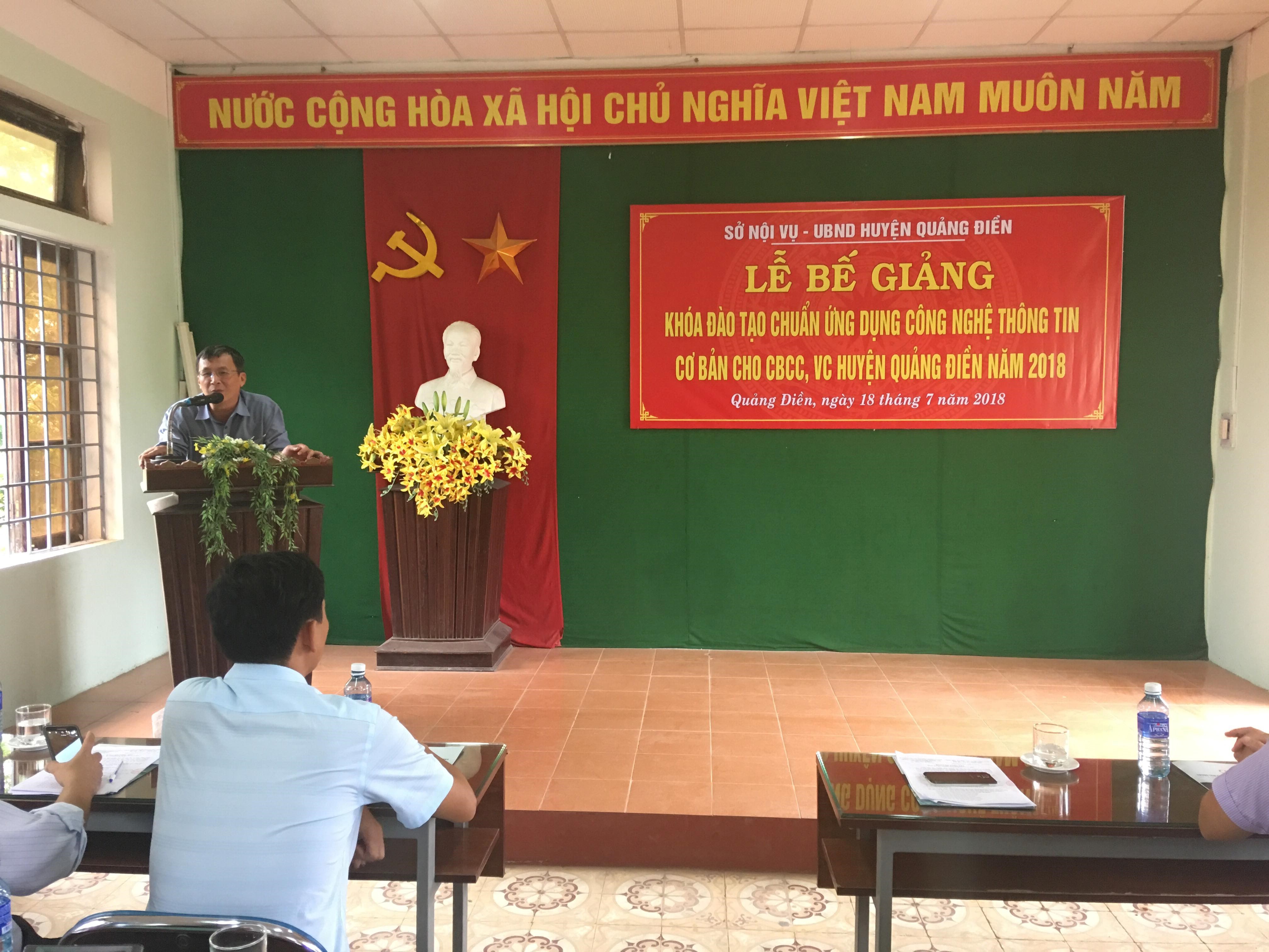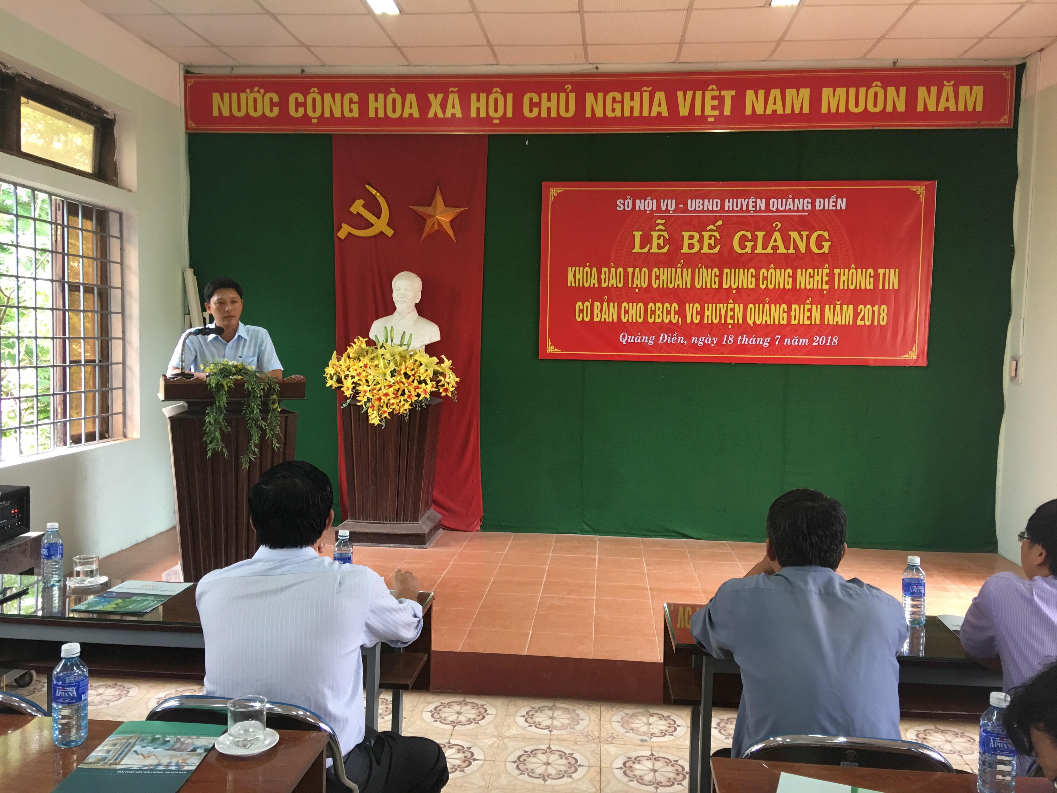 Thay mặt cho Trung tâm CNTT&TT, đ/c Hồ Văn An đã báo cáo tổng kết chương trình đào tạo "Chuẩn Ứng dụng Công nghệ thông tin cơ bản" cho cán bộ, công chức, viên chức trên địa bàn huyện Quảng Điền năm 2018.