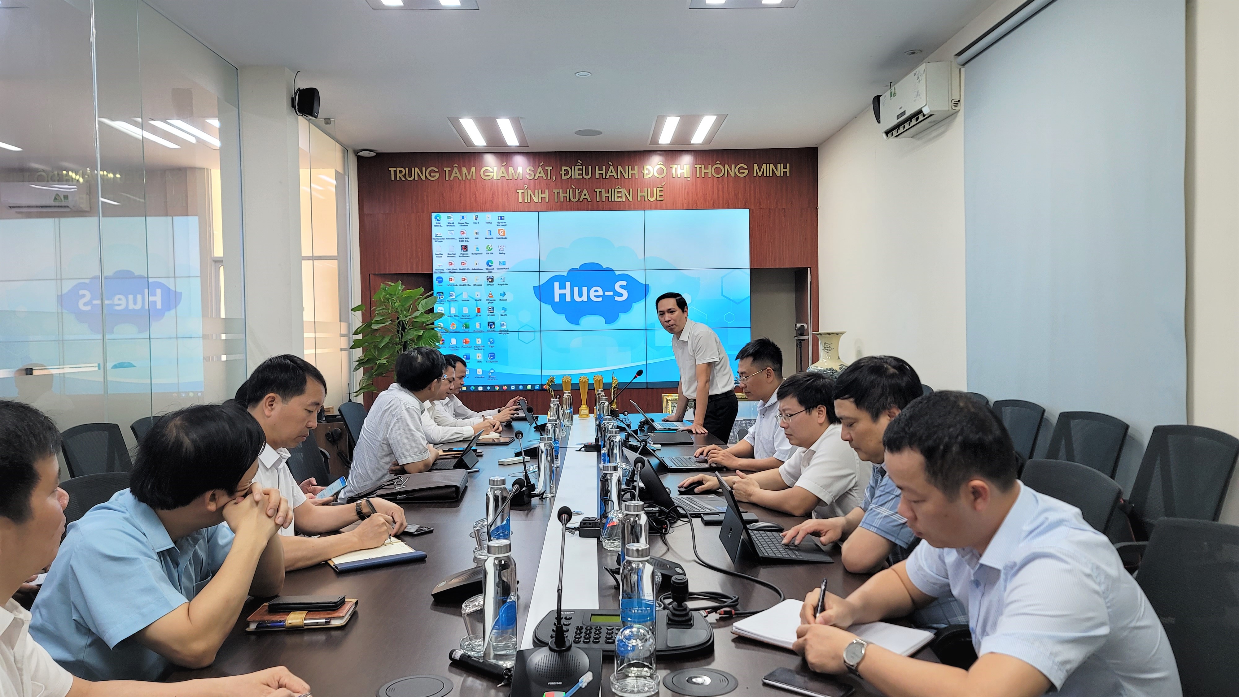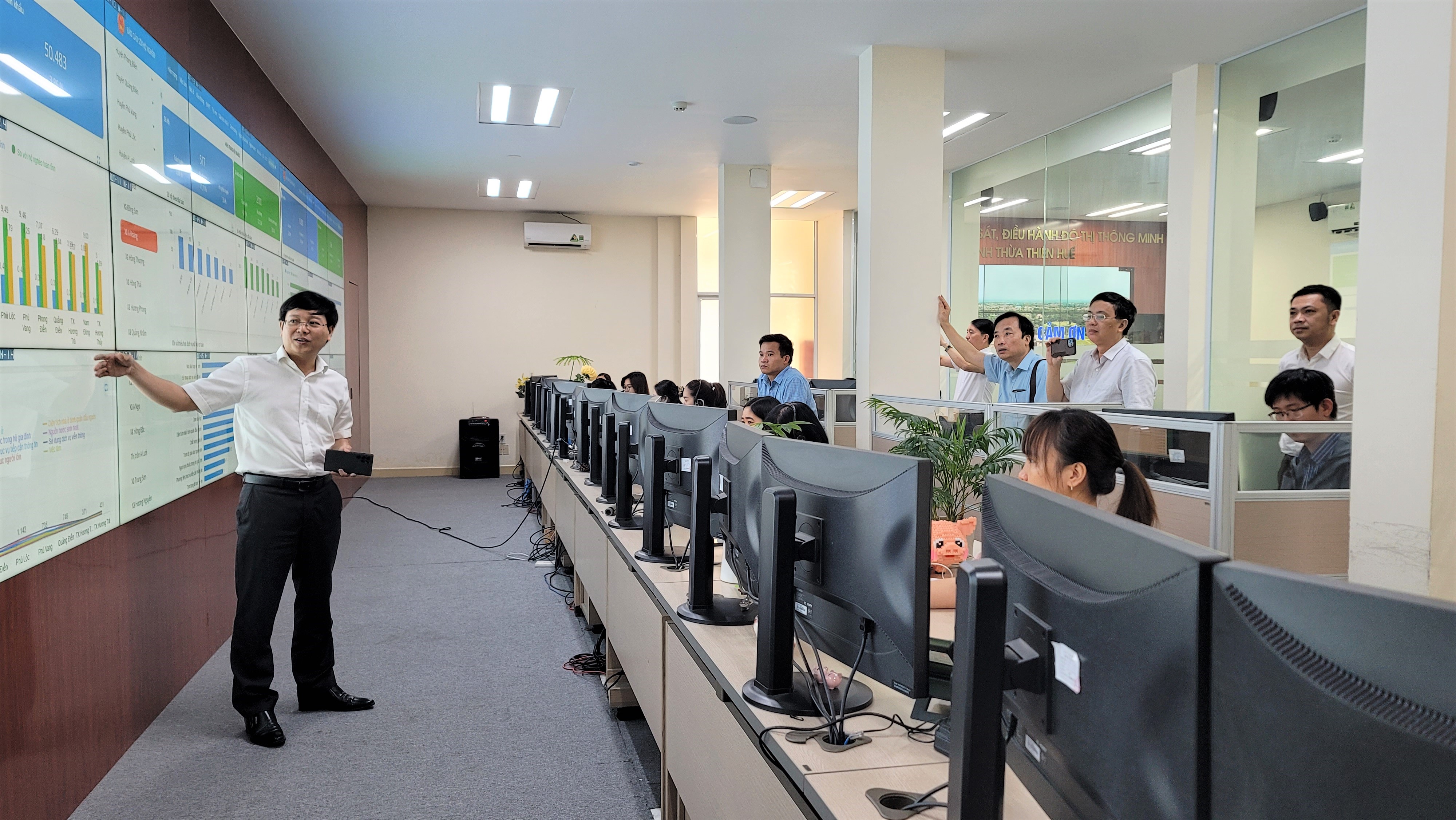 Đoàn Công tác cũng đã được nghe đồng chi Bùi Hoàng Minh - Giám đốc Trung tâm IOC trình bày báo cáo quá trình thành lập, xây dựng và những kết quả nổi bật đã đạt được của các dịch vụ đô thị thông minh đang triển khai và vận hành tại Trung tâm IOC và đặc biệt là công tác xây dựng, phát triển và vận hành nền tảng chuyển đổi số đặc thù của Thừa Thiên Huế - Hue-S.