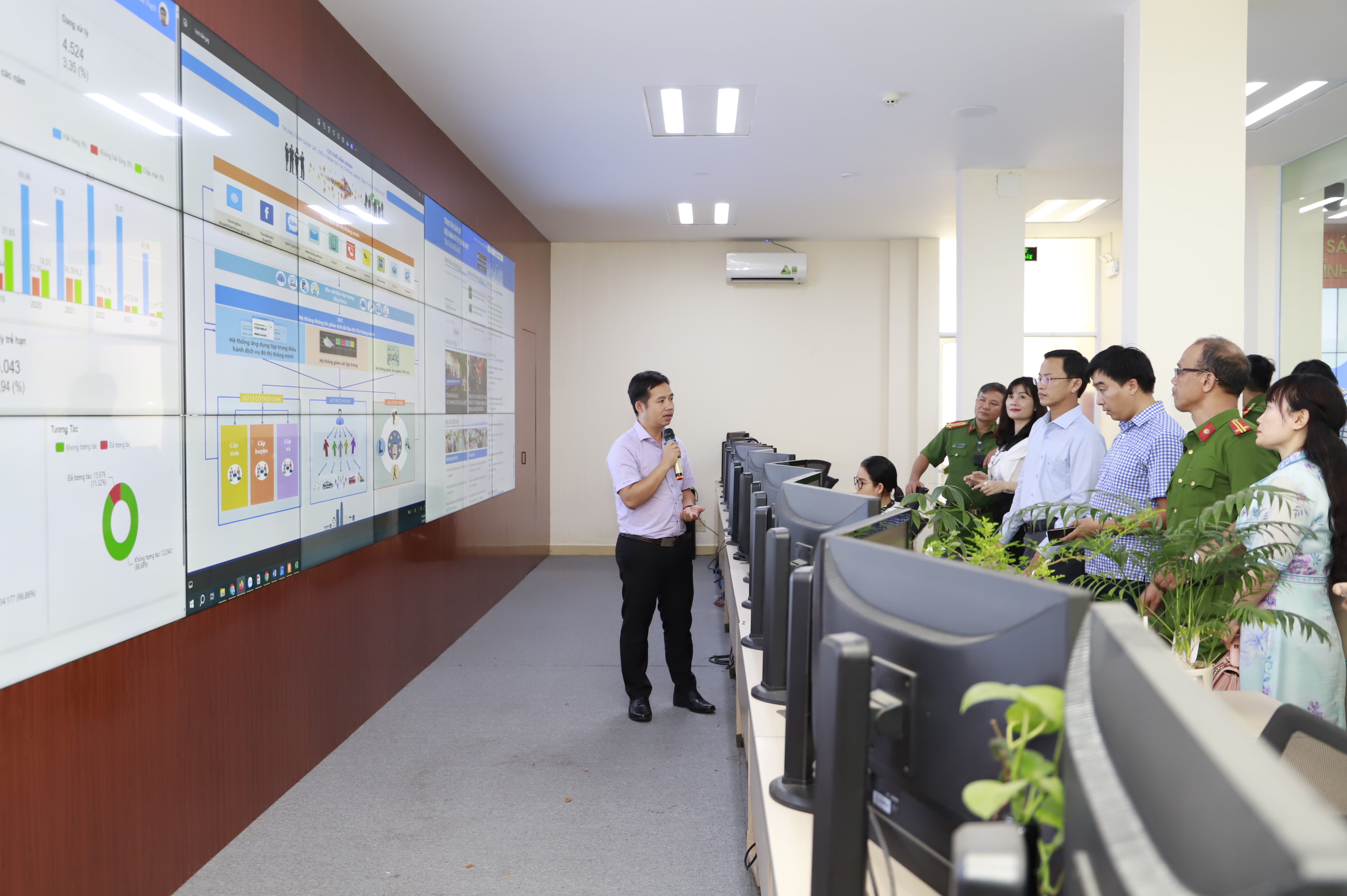 Sáng ngày 12/8/2024, Đoàn công tác Sở Nội vụ tỉnh Bình Định do đồng chí Nguyễn Thanh Vũ - Phó Giám đốc Sở Nội vụ tỉnh Bình Định làm Trưởng đoàn đã đến tham quan, trao đổi kinh nghiệm về công tác trên lĩnh vực cải cách hành chính, chuyển đổi số và Đề án 06 tại Trung tâm Giám sát, điều hành đô thị thông minh (IOC); cùng đại diện lãnh đạo và công chức các phòng chuyên môn thuộc các cơ quan của tỉnh Bình Định: Công an tỉnh, Văn phòng Ủy ban nhân dân tỉnh, Sở Nội vụ, Sở Thông tin và Truyền Thông, Sở Tài chính, Sở Tư pháp, Sở Kế hoạch và Đầu tư.
