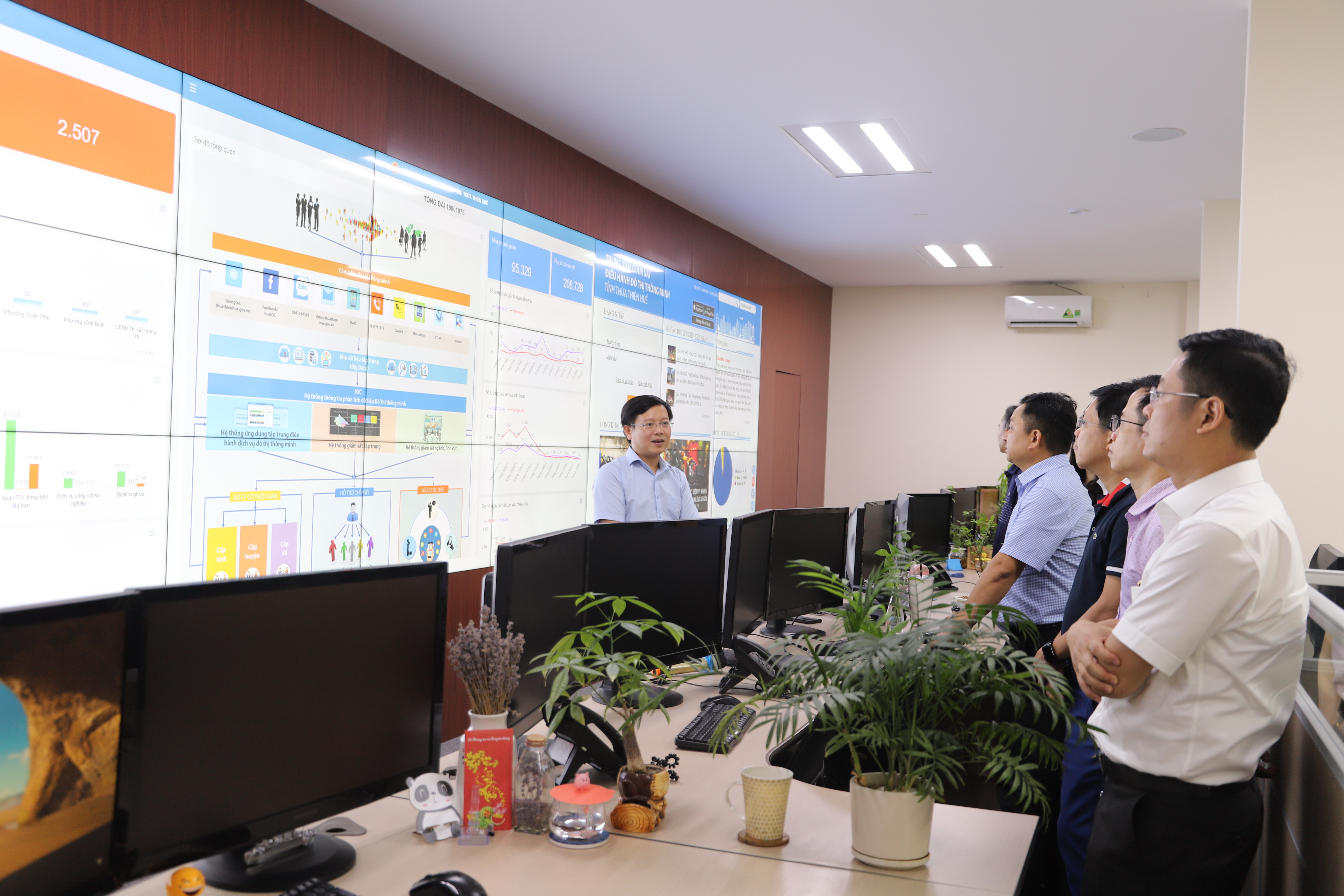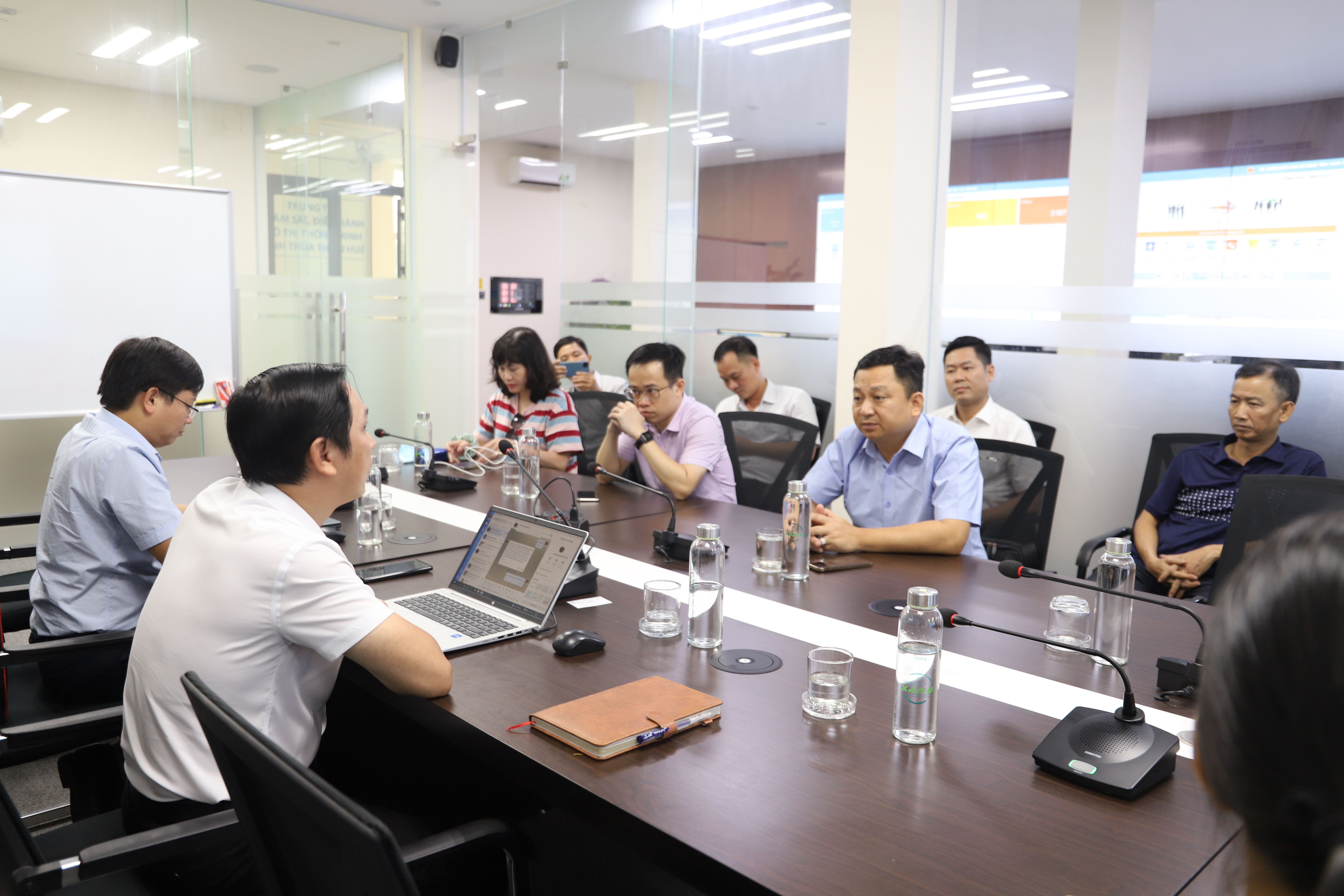 Mở đầu buổi làm việc, đoàn đã được nghe đồng chí Bùi Hoàng Minh giới thiệu về quy trình vận hành cũng như những kết quả đạt được trong việc triển khai các dịch vụ đô thị thông minh như vụ phản ánh hiện trường, giám sát vi phạm giao thông, giám sát thông tin báo chí... và hệ thống tổng đài 19001075 đã trở thành công cụ đắc lực phục vụ người dân và chính quyền kể cả trong đời sống hằng ngày lẫn công việc.
