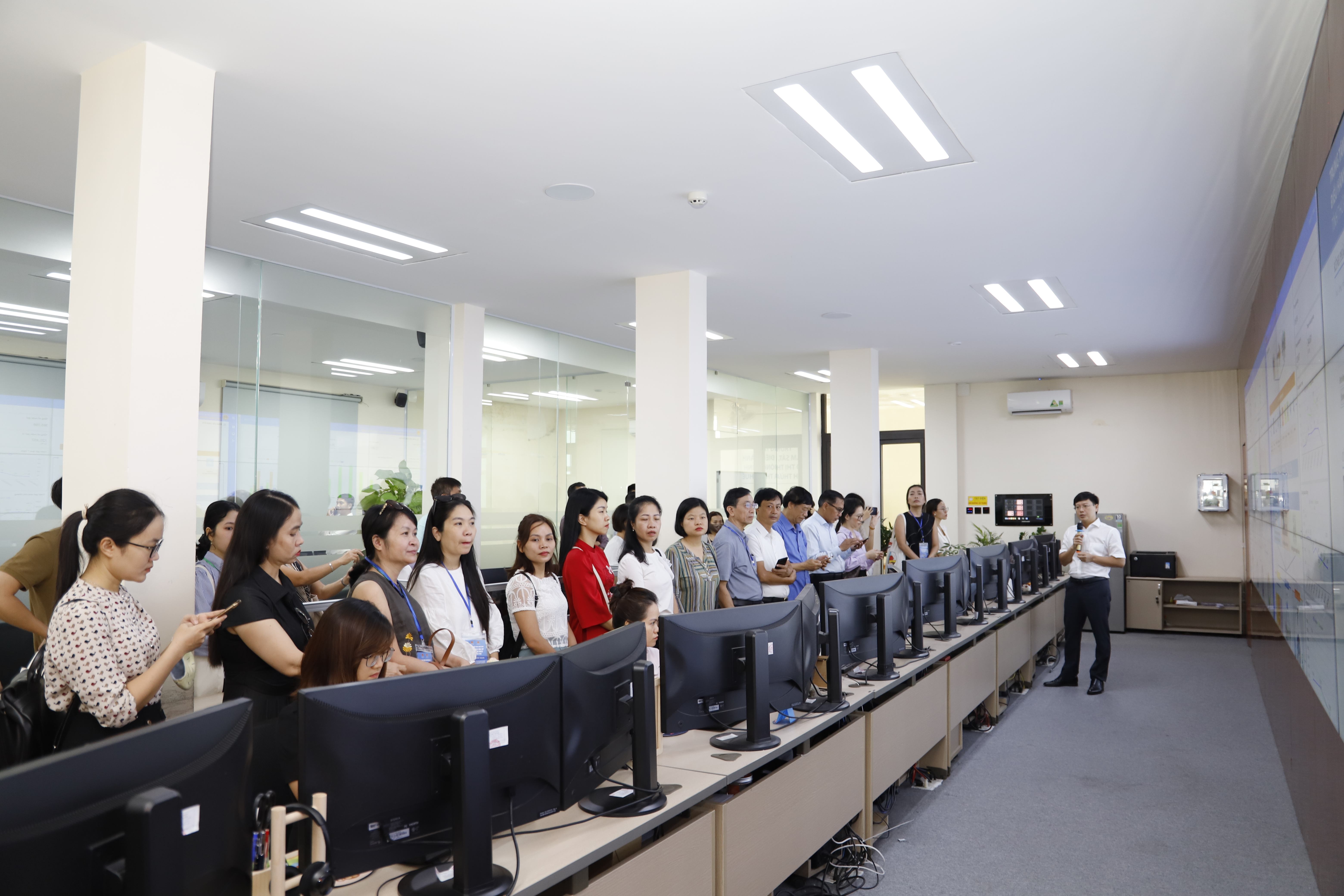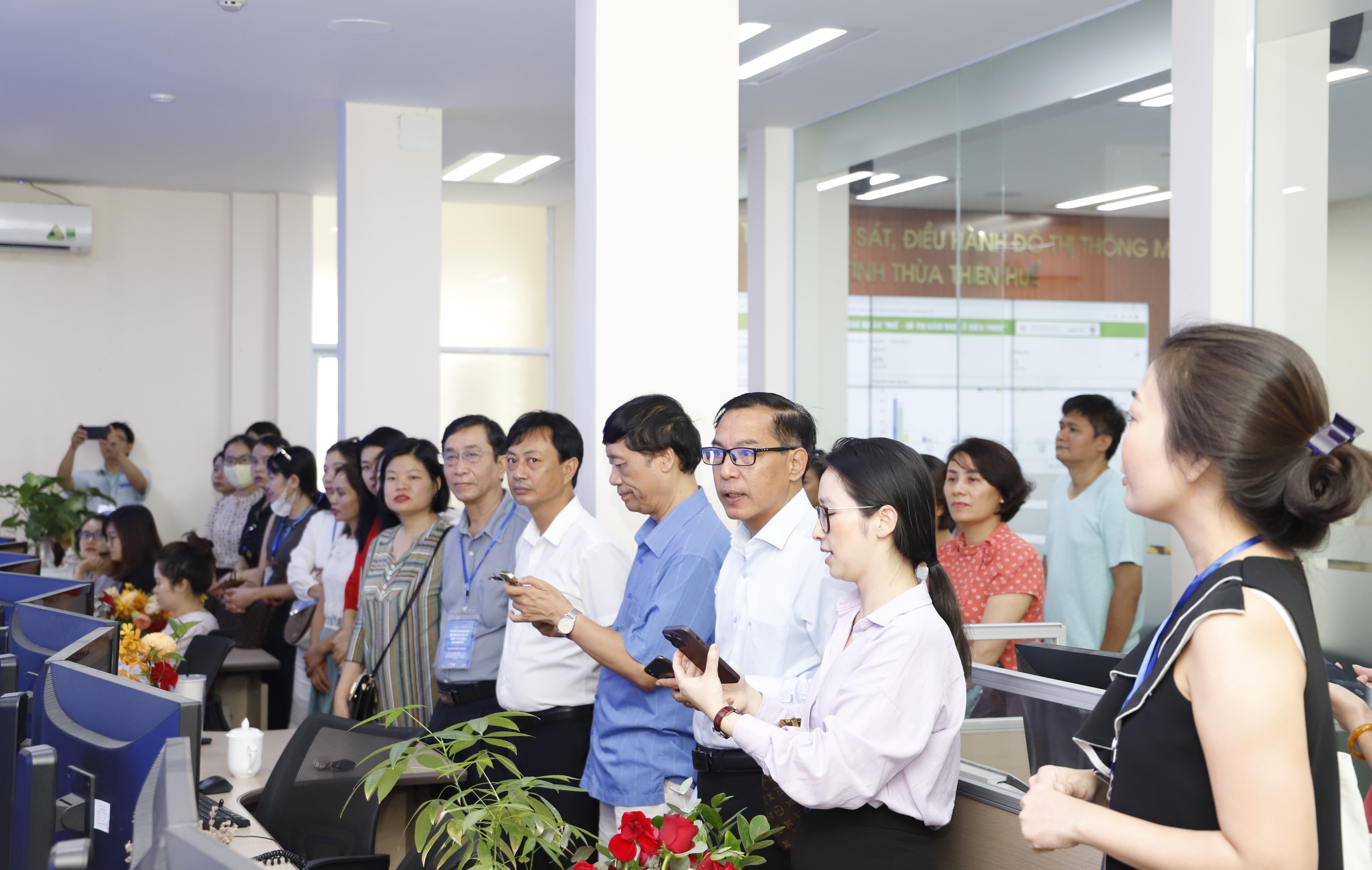 Đoàn đại biểu đã được nghe giới thiệu về chức năng và những kết quả nổi bật đã đạt được của hơn 20 dịch vụ đô thị thông minh đang triển khai và vận hành tại Trung tâm IOC như phản ánh hiện trường, giám sát vi phạm giao thông, giám sát môi trường, giám sát thông tin báo chí, giám sát hồ đập…