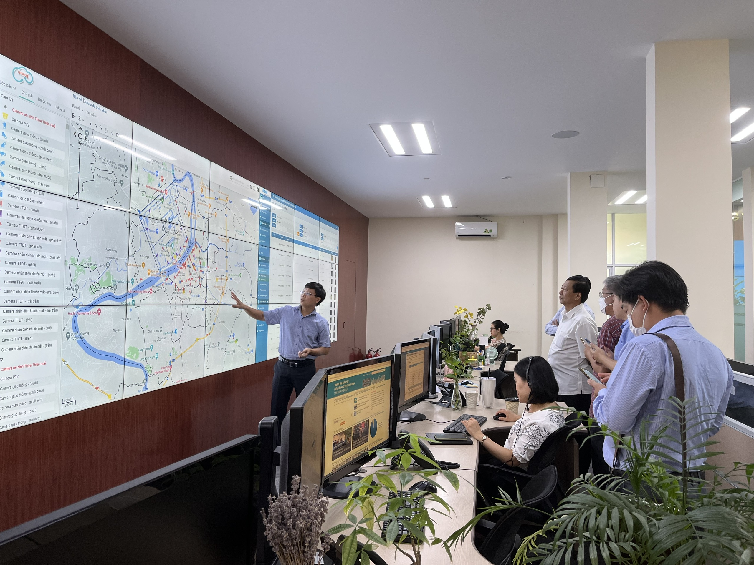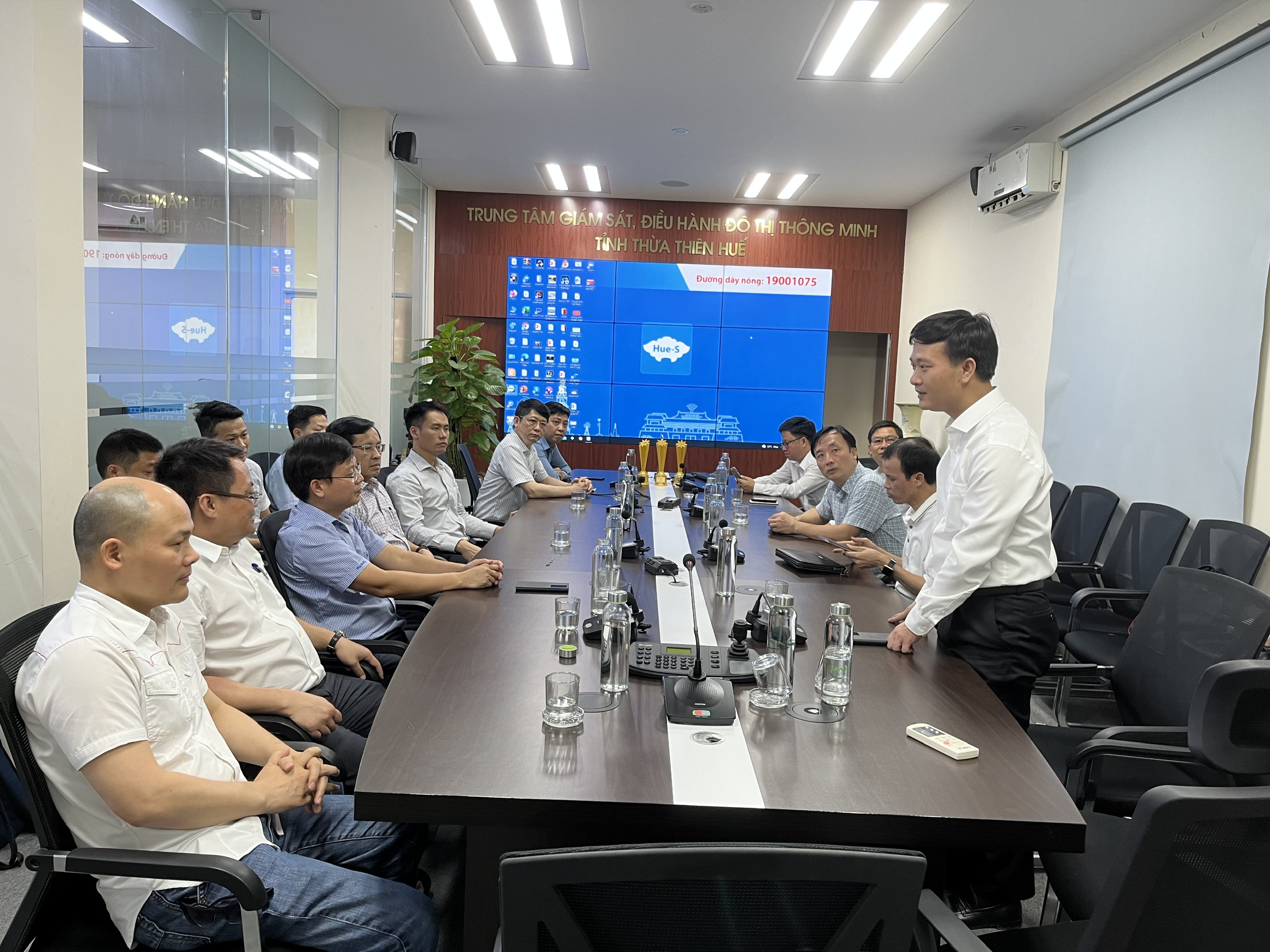 Mở đầu buổi làm việc, đoàn Công tác đã được nghe đồng chí Bùi Hoàng Minh – Giám đốc Trung tâm IOC giới thiệu hơn 20 dịch vụ đô thị thông minh đang triển khai nhất là dịch vụ phản ánh hiện trường, giám sát vi phạm giao thông, giám sát thông tin báo chí,… Thông qua giải pháp giám sát camera, hiện nay trên địa bàn tỉnh đã triển khai hơn 560 camera giúp nhận diện các vi phạm giao thông, cảnh báo cháy,… Trong các dịch vụ đô thị thông minh đang triển khai, phản ánh hiện trường là dịch vụ tiên phong và đồng hành cùng người dân trong việc xử lý các phản ánh trong đời sống hằng ngày từ khi ra đời đến nay là hệ thống tổng đài 19001075