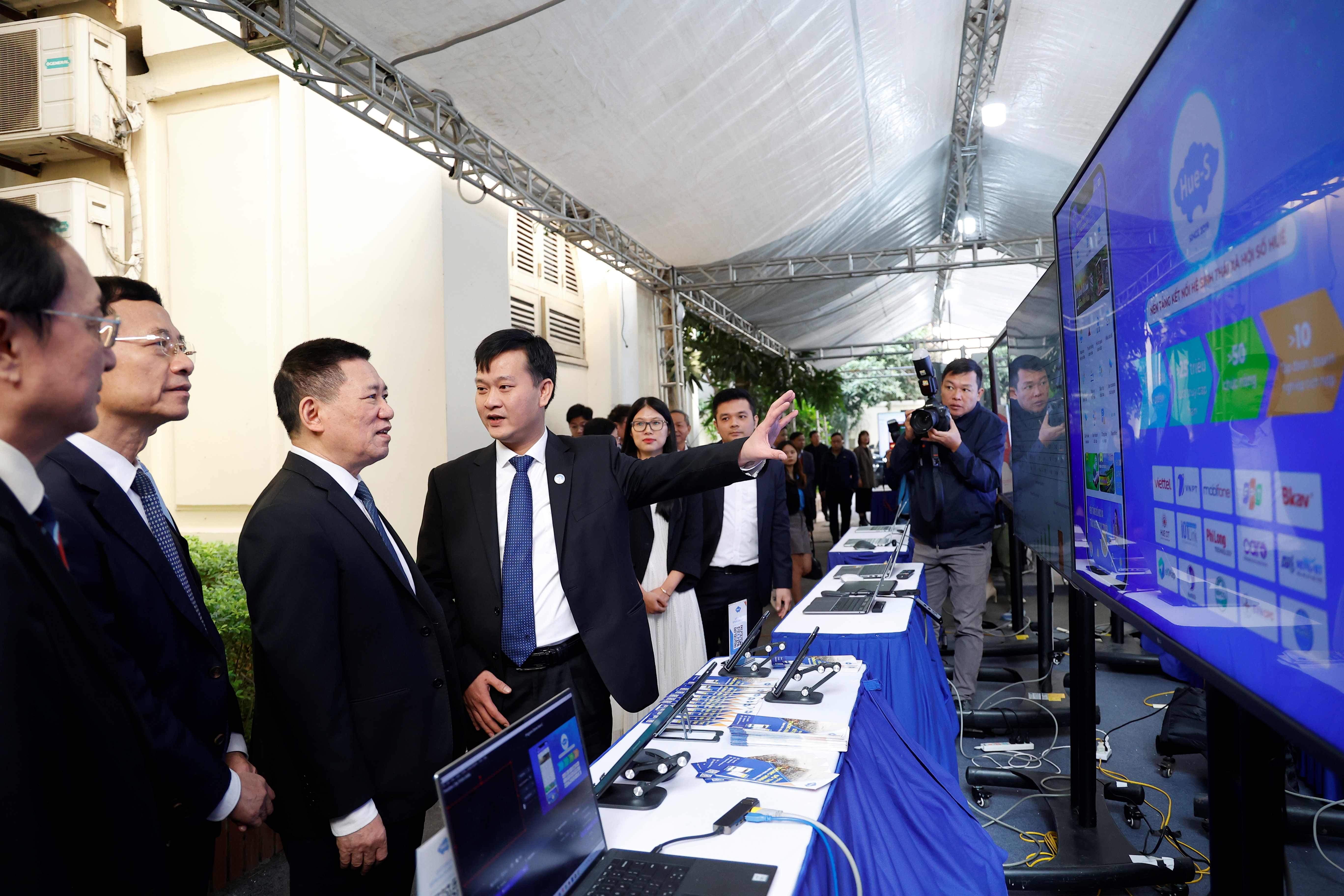Đồng chí Nguyễn Xuân Sơn – Giám đốc Sở TTTT giới thiệu nền tảng Hue-S với Phó Thủ tướng Chính phủ Hồ Đức Phớc, và các đồng chí Lãnh đạo tại gian hàng triển lãm