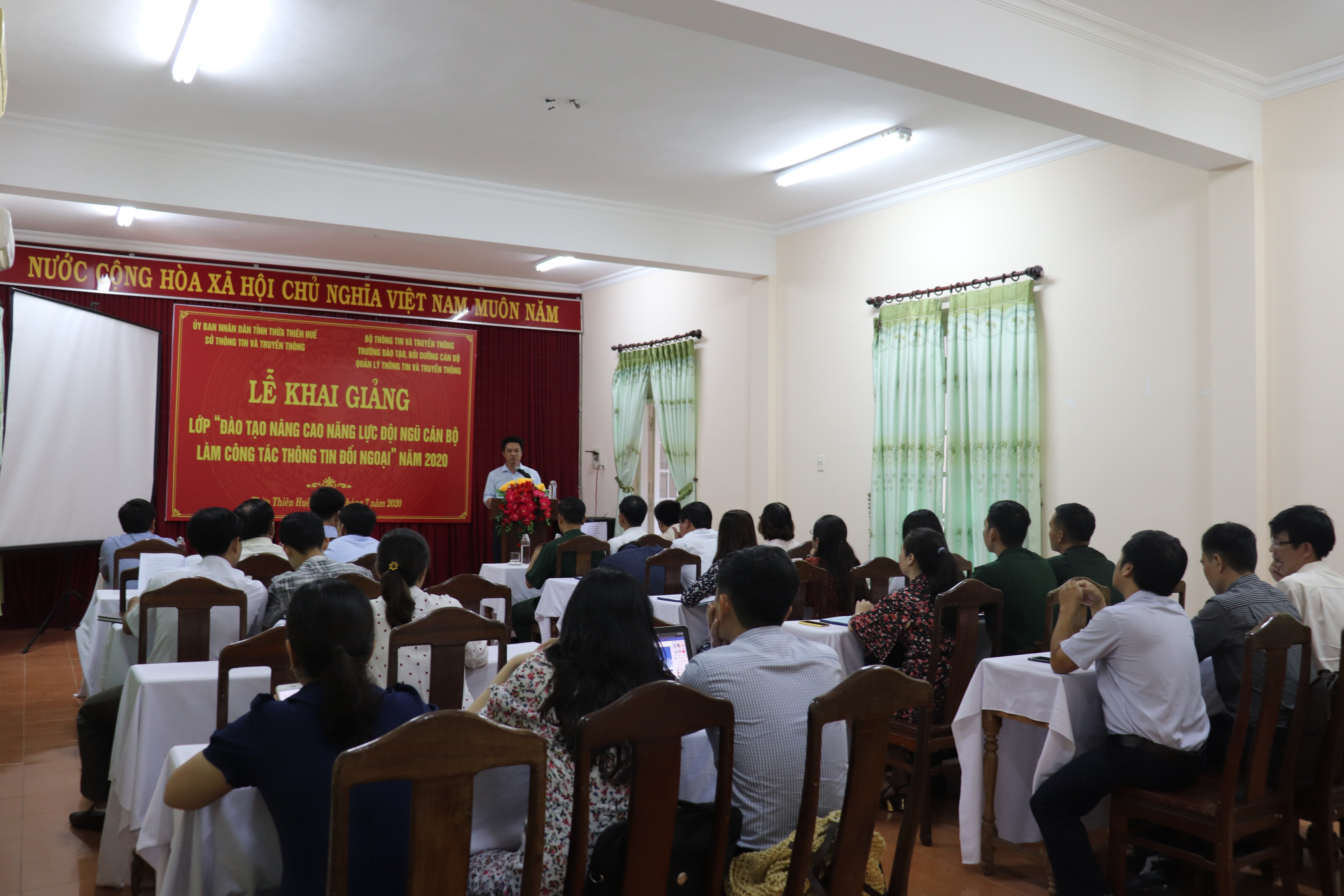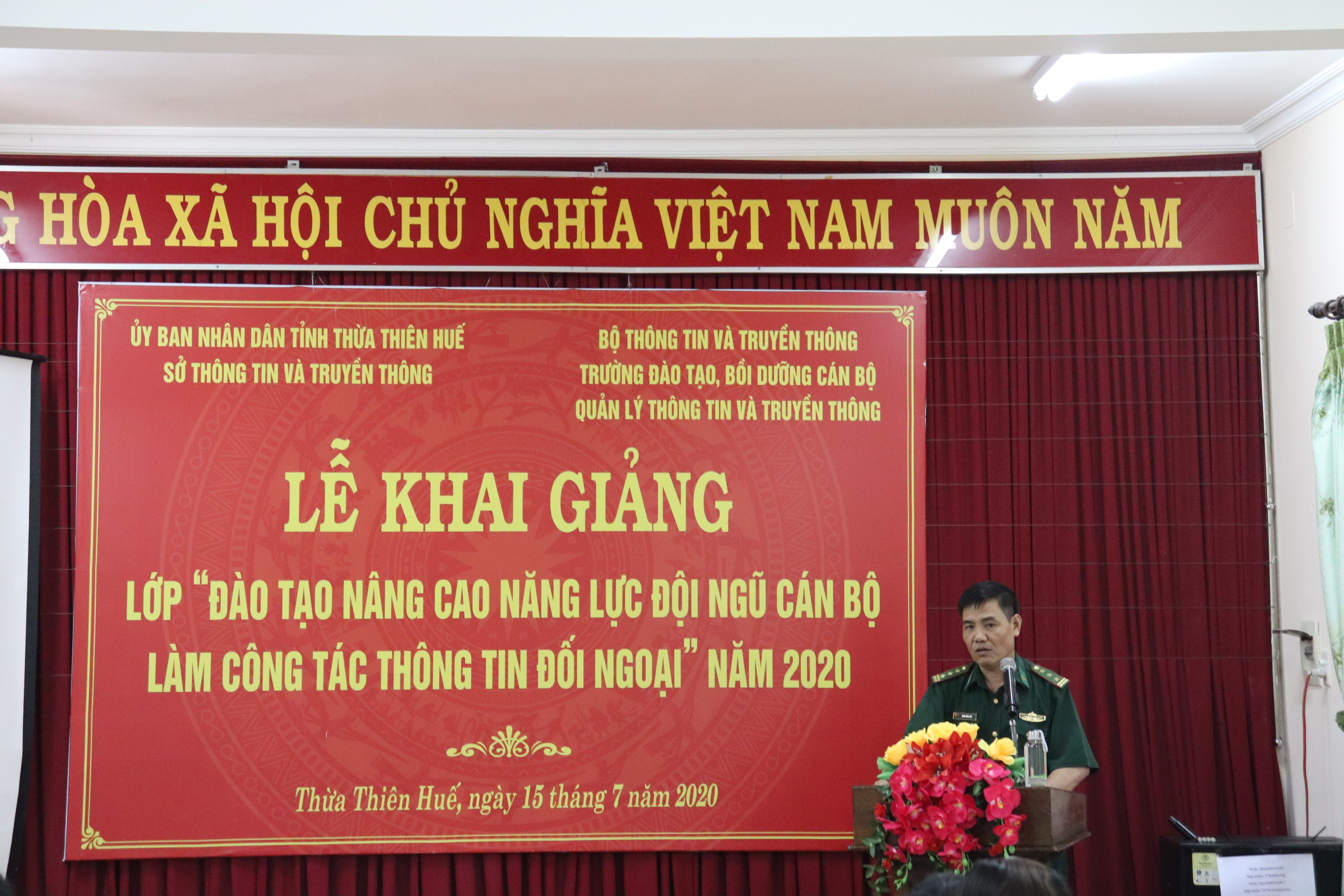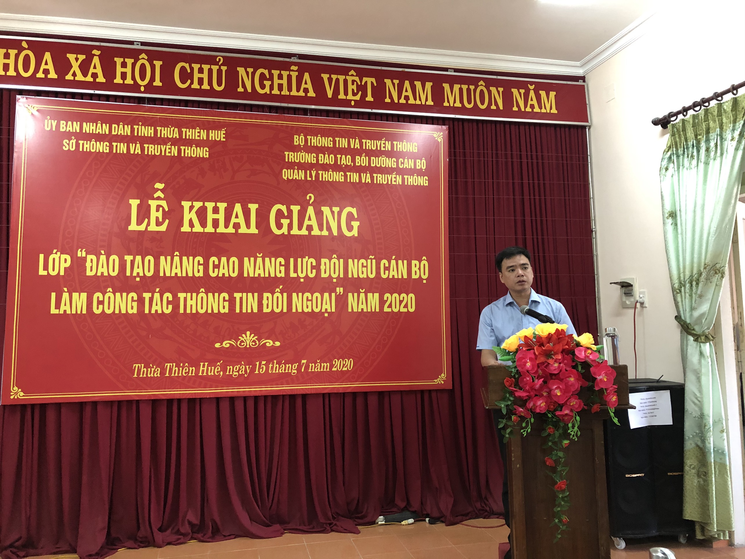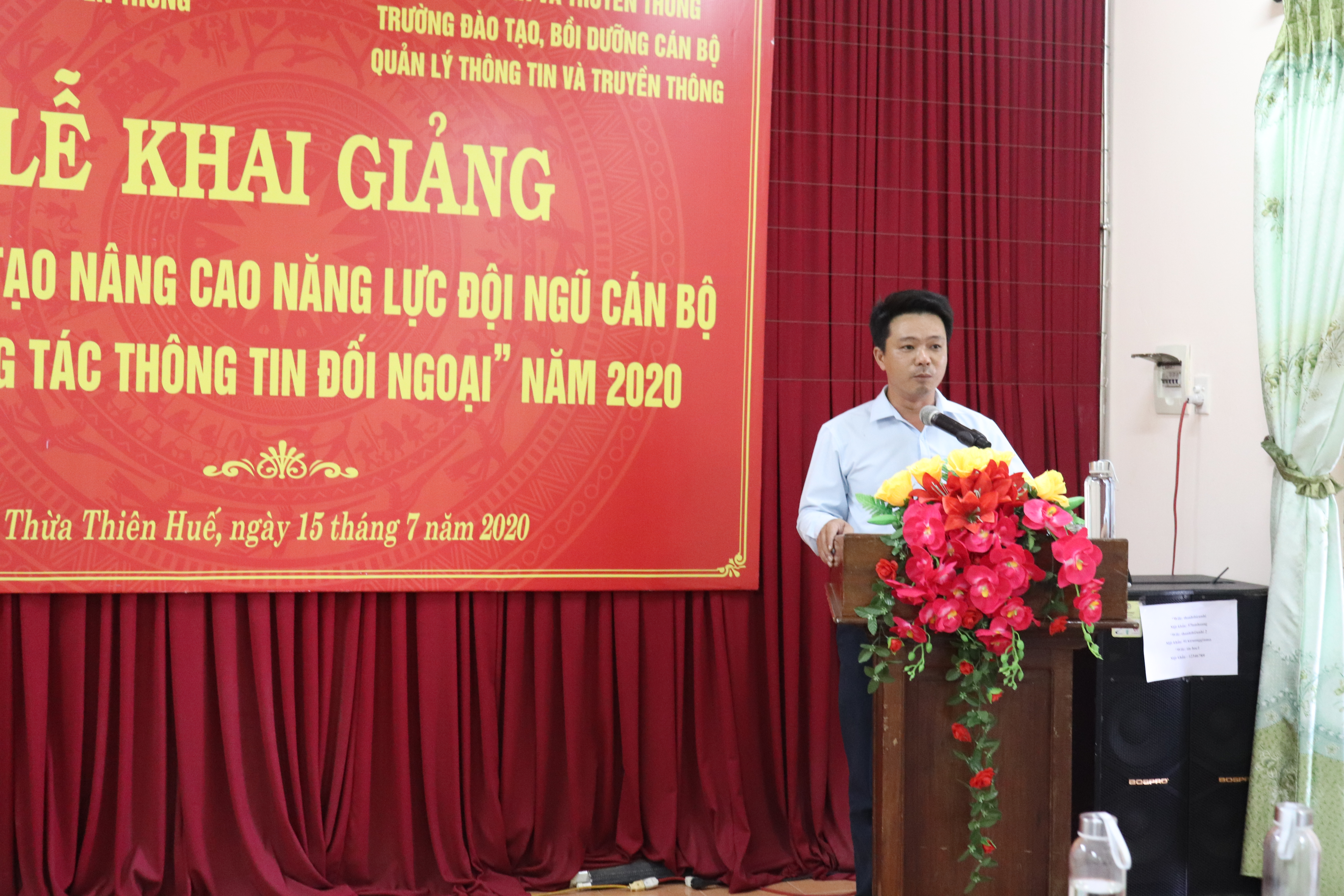 Phát biểu tại buổi Lễ, đ/c Nguyễn Huy Hiển nêu rõ mục đích, yêu cầu và ý nghĩa của khóa học, đồng chí cám ơn sự quan tâm của lãnh đạo Trường Đào tạo, bồi dưỡng cán bộ quản lý thông tin và truyền thông đã tổ chức khóa “Bồi dưỡng kiến thức về chính sách, hoạt động thông tin đối ngoại” và chương trình “Kỹ năng khai thác thông tin, đưa tin” và chương trình “Kỹ năng giao tiếp đối ngoại” cho Thừa Thiên Huế. Đồng chí nhấn mạnh tầm quan trọng của khóa học. Đồng chí căn dặn các học viên nên tham gia đầy đủ, nghiêm túc và học tập, nghiên cứu kiến thức để chia sẻ hỗ trợ cho những cán bộ chưa được tham gia học.