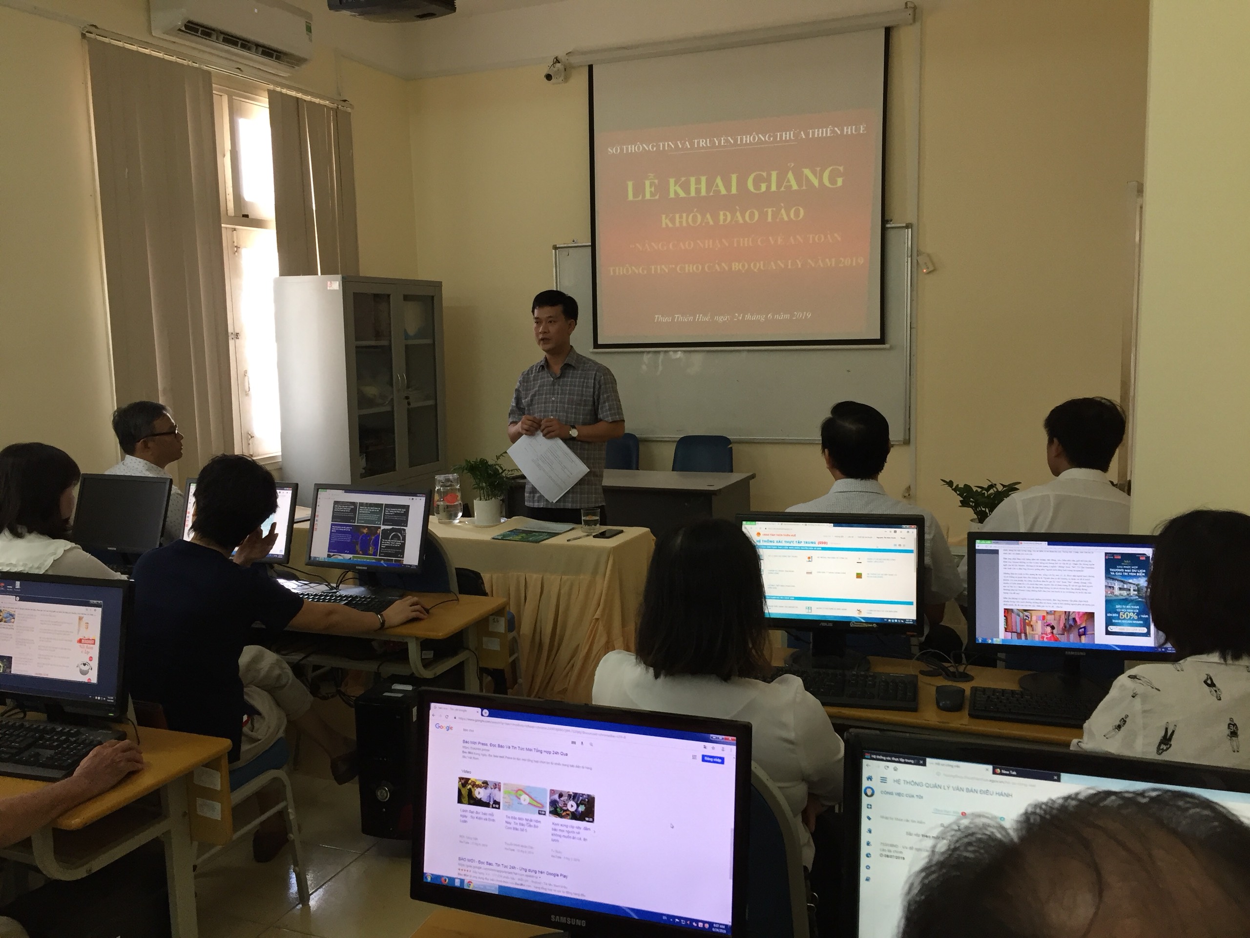 Sáng nay ngày 24/6/2019, Trung tâm Giám sát, điều hành đô thị thông minh tổ chức Lễ Khai giảng khoá đào tạo “Nâng cao nhận thức về An toàn thông tin cho cán bộ quản lý" lớp 2 - năm 2019 cho đối tượng cán bộ là Trưởng, Phó các phòng và tương đương của các cơ quan chuyên môn thuộc UBND tỉnh, UBND các huyện, thị xã và thành phố Huế.
