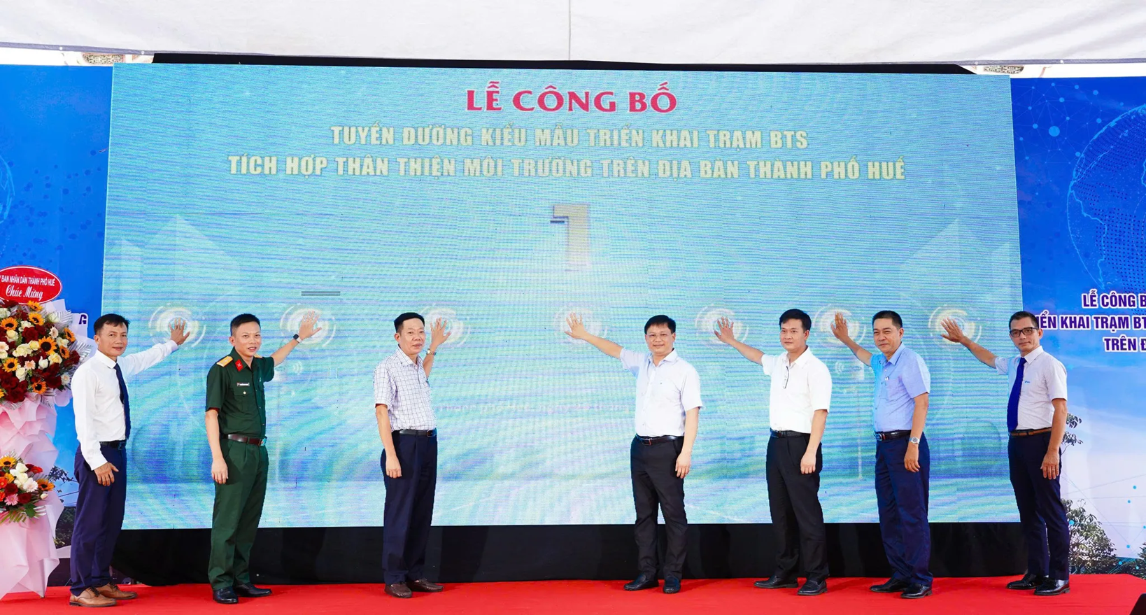 Đại diện các lãnh đạo, các doanh nghiệp viễn thông thực hiện Nghi thức công bố tuyến đường kiểu mẫu triển khai trạm BTS tích hợp thân thiện môi trường