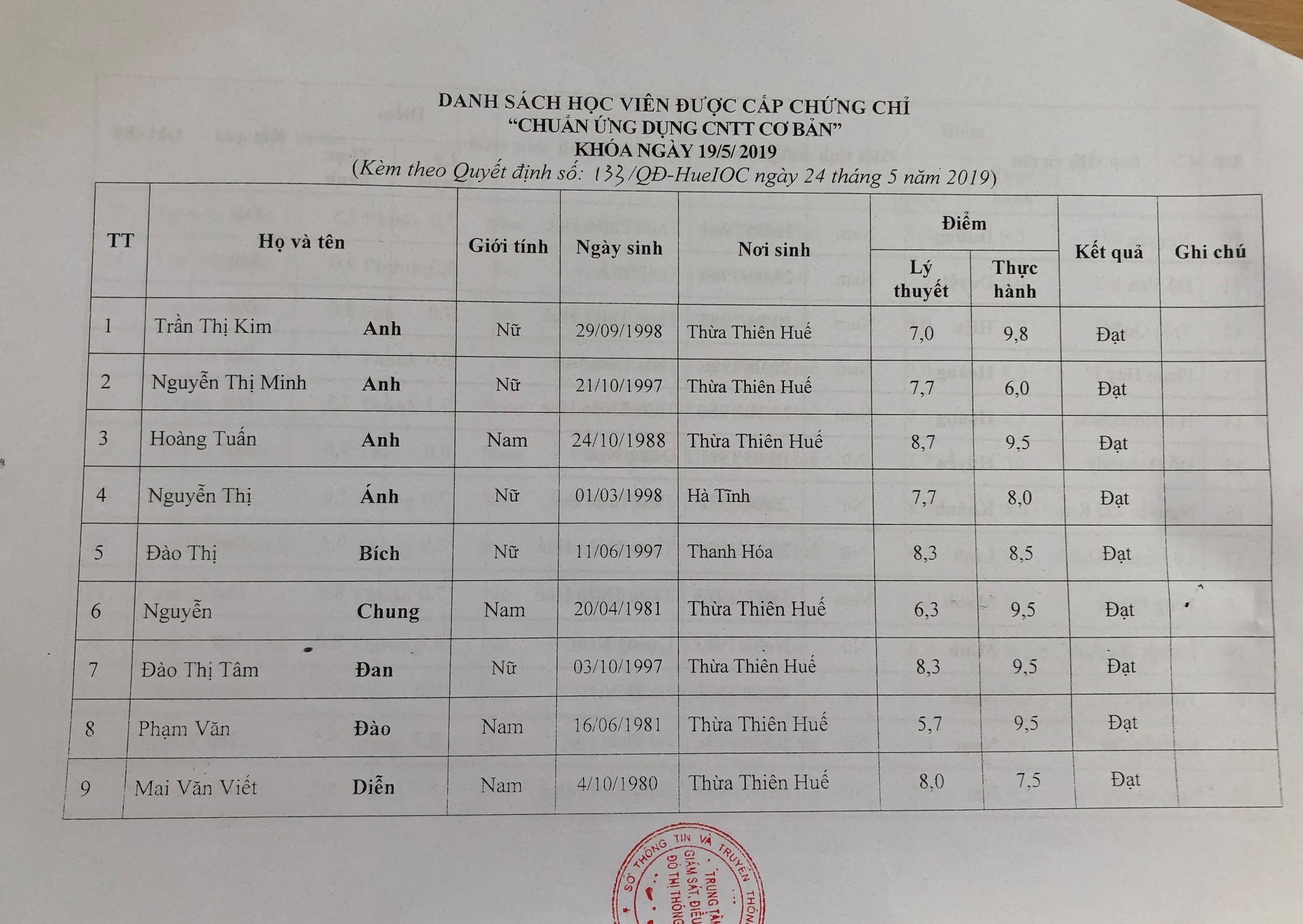 Thông báo kết quả thi chứng chỉ chuẩn ứng dụng CNTT cơ bản_đợt 2 (19/5/2019).