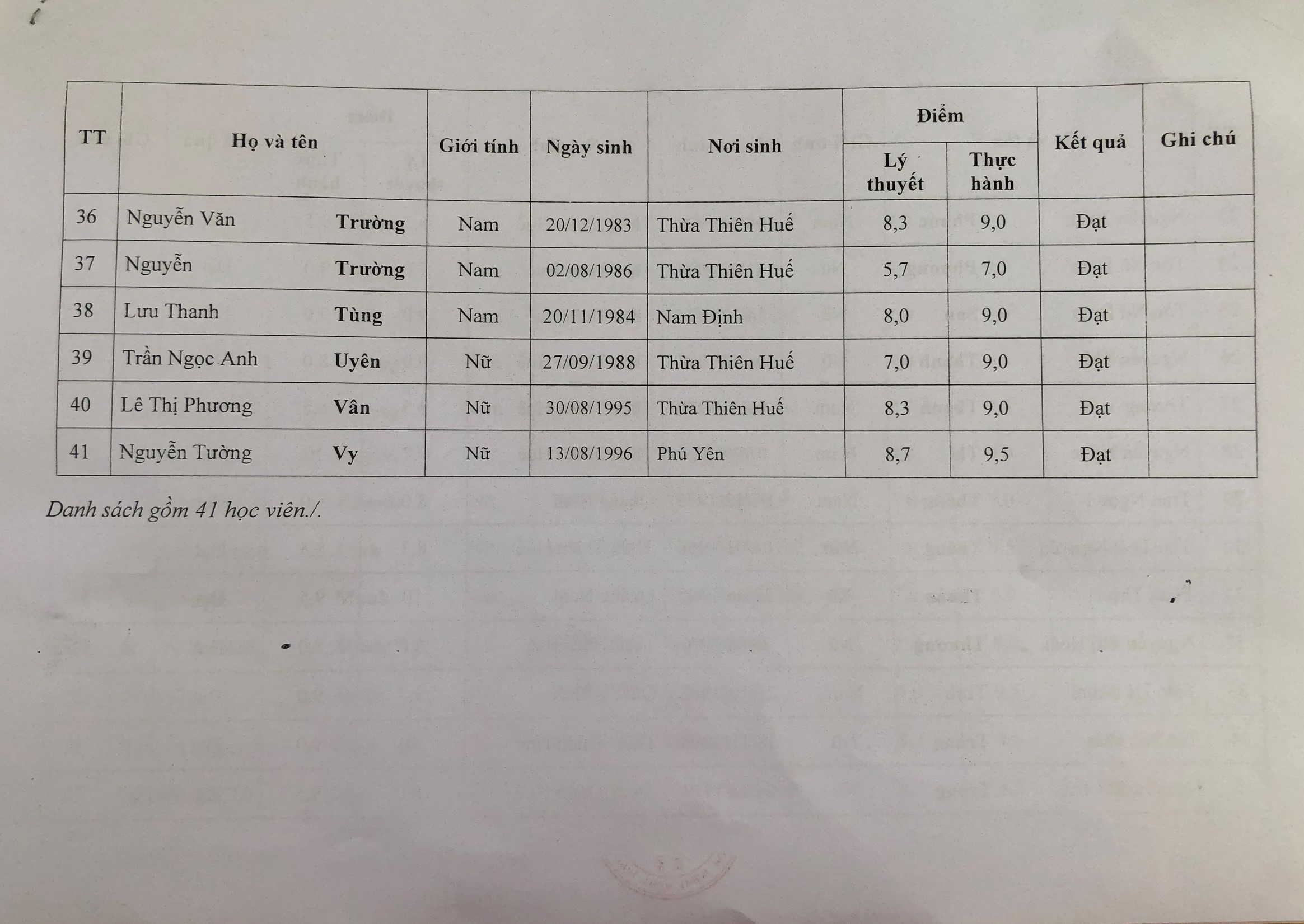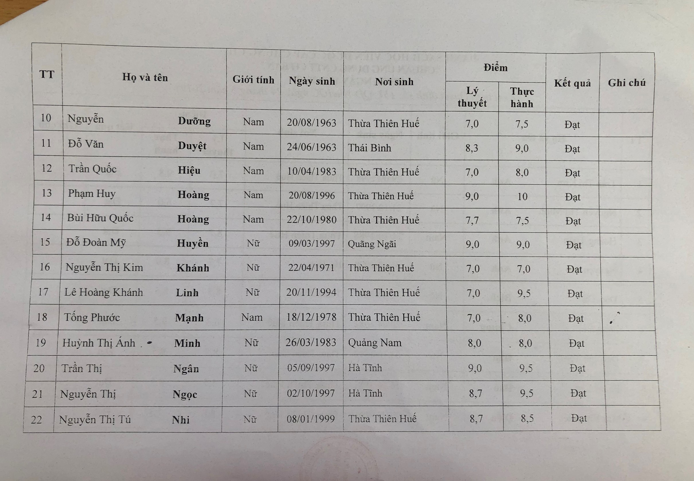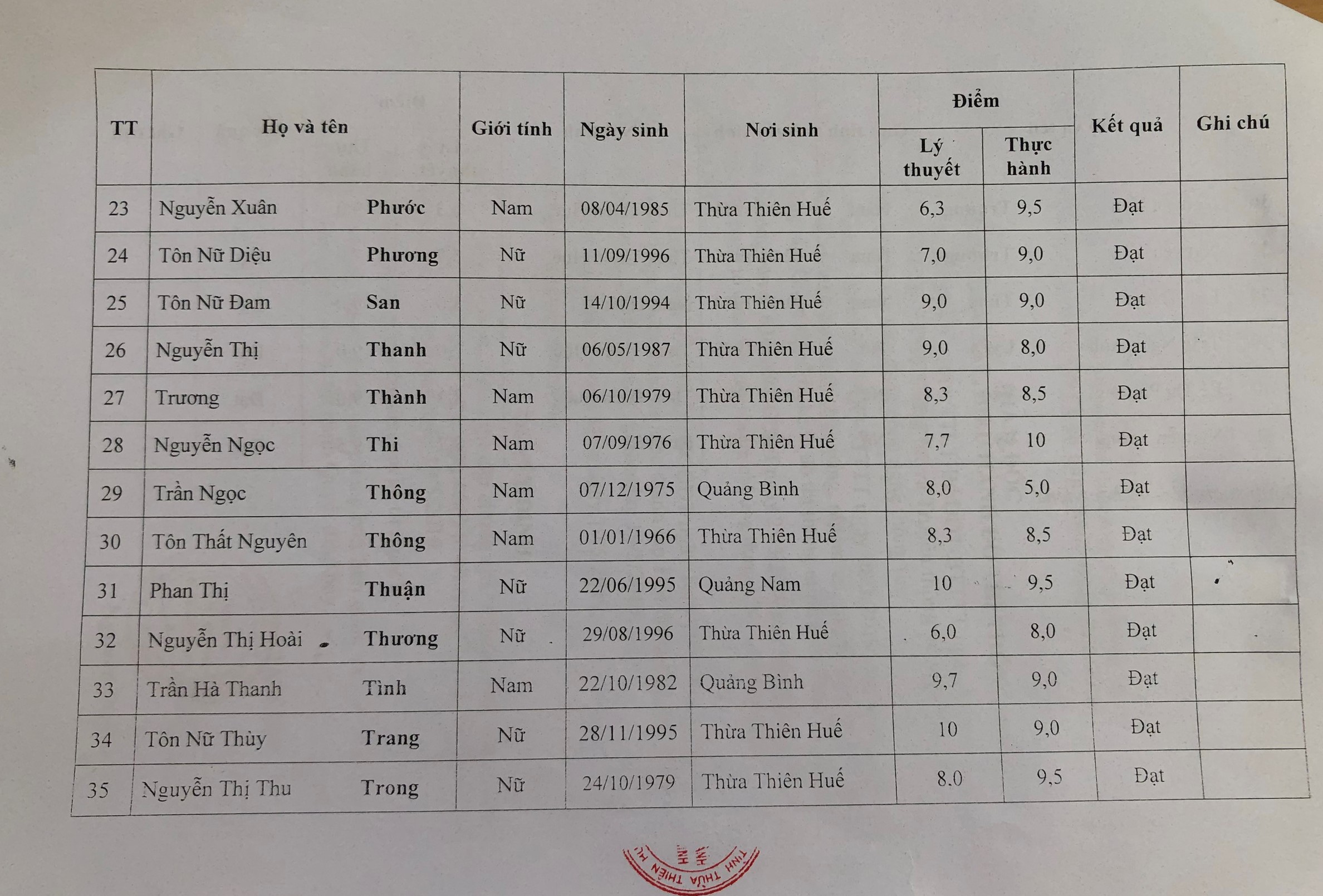 Các học viên có kết quả "ĐẠT" chú ý kiểm tra thông tin cá nhân như "Ngày sinh" và "Nơi sinh" chính xác. Nếu sai sót vui lòng gửi về email "ntmtram.stttt@thuathienhue.gov.vn" để chỉnh sửa.