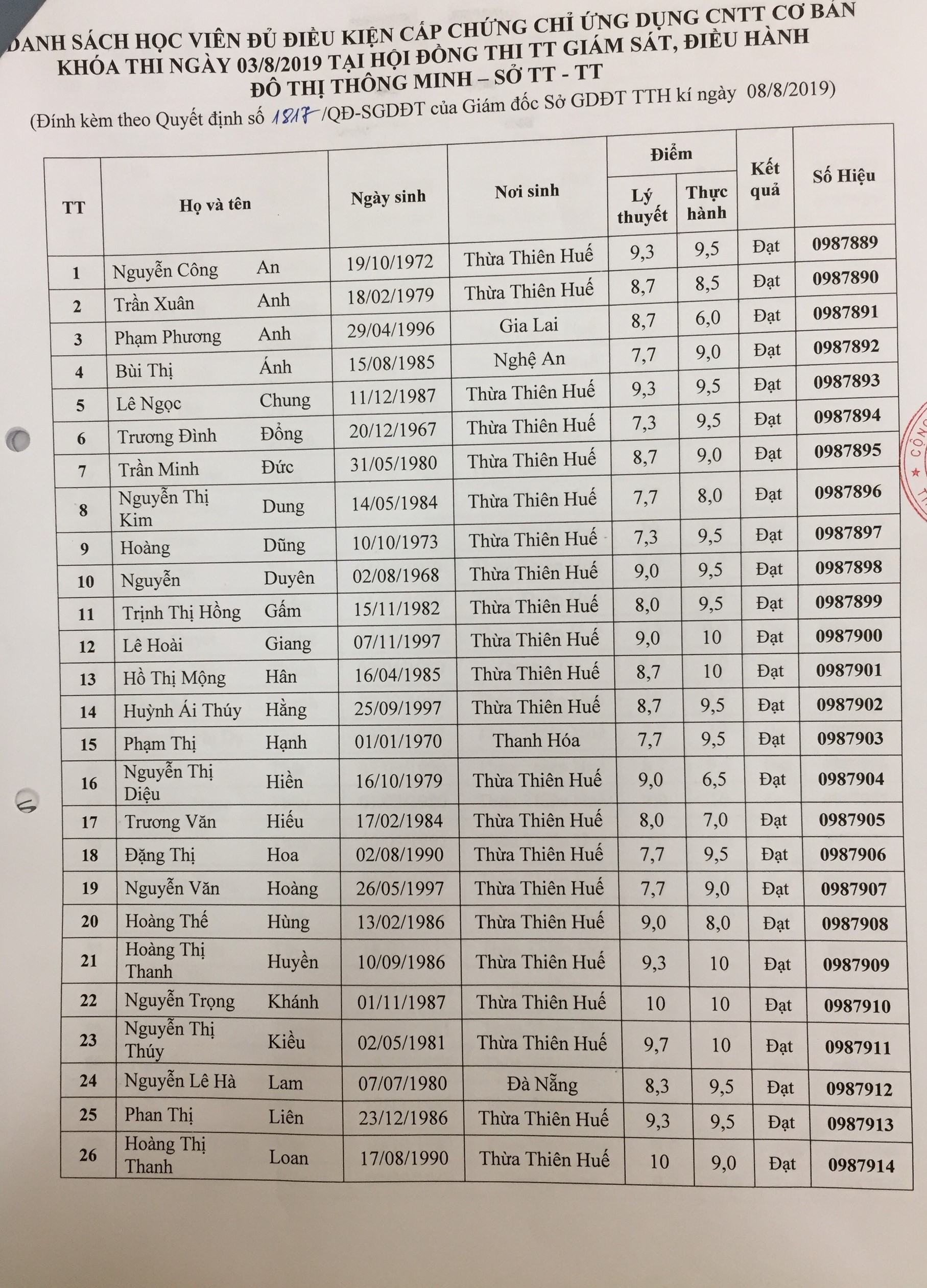 Thông báo kết quả thi chứng chỉ Ứng dụng CNTT cơ bản_đợt 4 (03/8/2019)