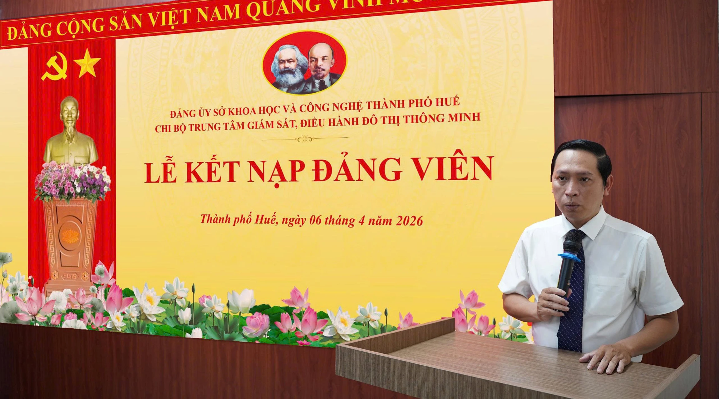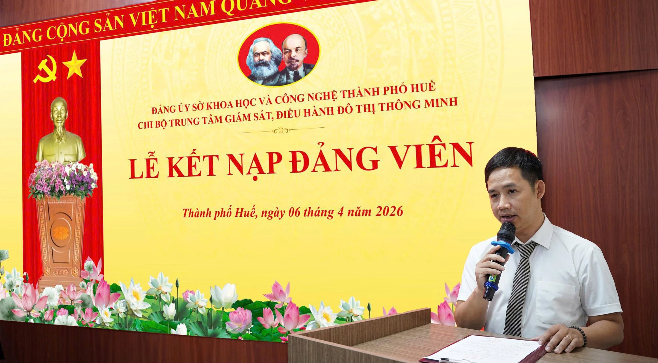 Lễ Kết nạp Đảng viên mới diễn ra trong không khí trang nghiêm, đúng trình tự, quy định của Điều lệ Đảng. Thay mặt Chi bộ Trung tâm HueIOC, đồng chí Trần Trọng Hiếu - Đảng ủy viên, Bí thư Chi bộ Trung tâm HueIOC đã trao Quyết định của Đảng ủy UBND thành phố cho đồng chí Đảng viên mới Trần Văn Mai.