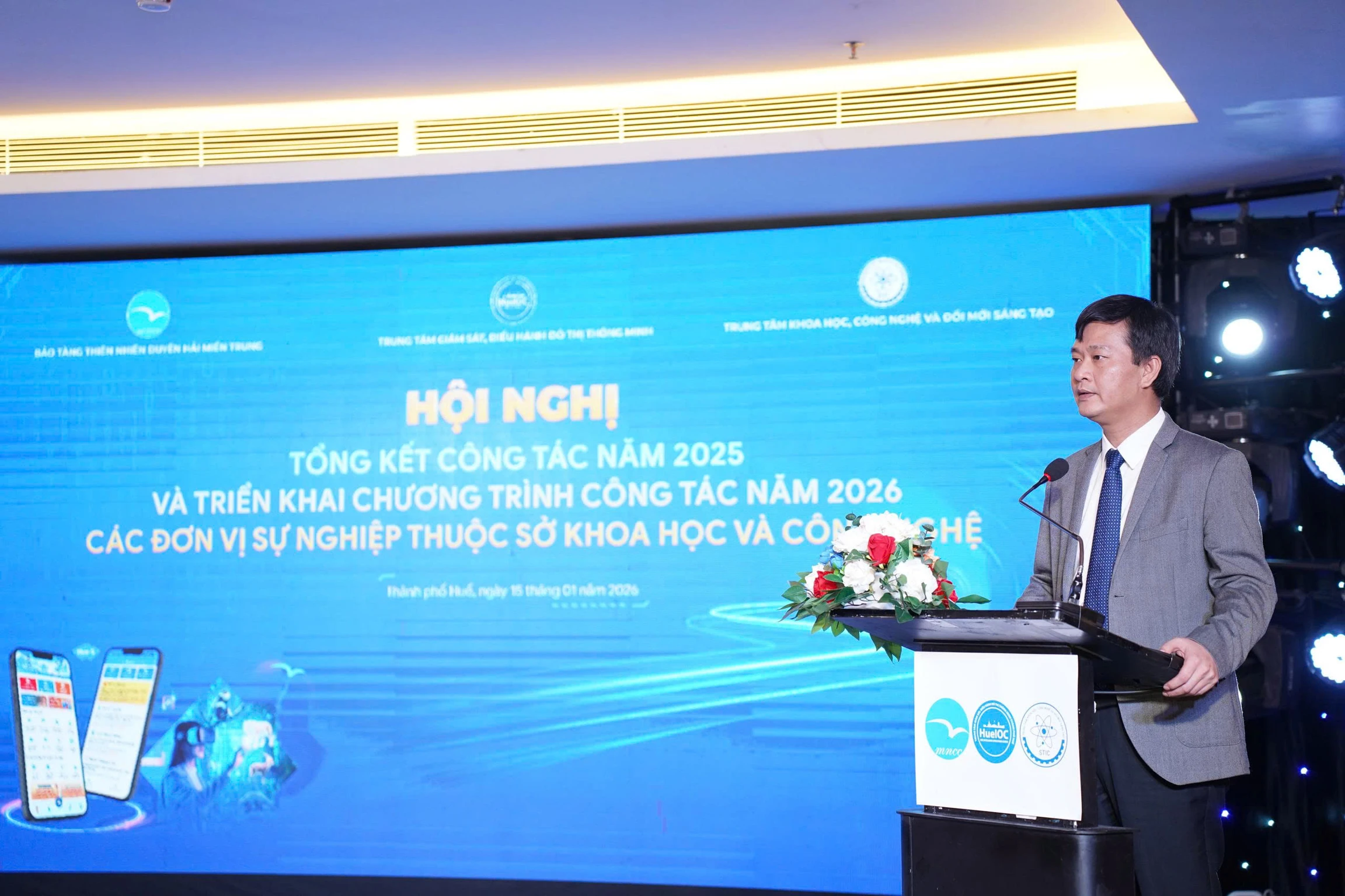 Phát biểu chỉ đạo tại Hội nghị, đồng chí Nguyễn Xuân Sơn - Thành uỷ viên, Bí thư Đảng uỷ, Giám đốc Sở KH&CN ghi nhận và đánh giá cao những kết quả mà Trung tâm HueIOC đã đạt được trong năm 2025. Đồng chí nhấn mạnh, trong bối cảnh Nghị quyết số 57-NQ/TW của Bộ Chính trị xác định phát triển khoa học, công nghệ, đổi mới sáng tạo và chuyển đổi số là đột phá chiến lược hàng đầu, vai trò của ngành KH&CN nói chung và Trung tâm HueIOC nói riêng ngày càng được khẳng định rõ nét trong công tác quản lý, điều hành và phục vụ phát triển chung của thành phố.