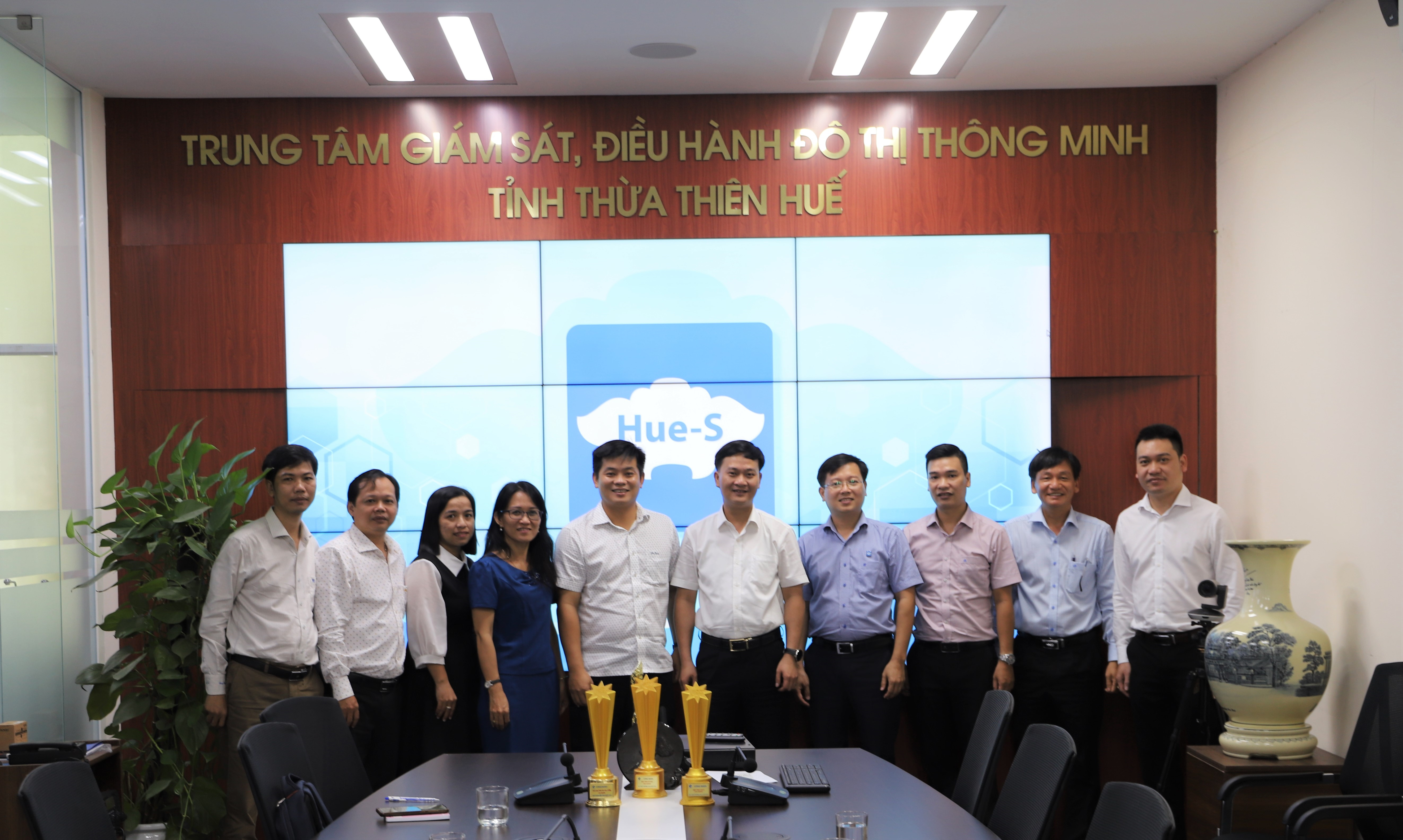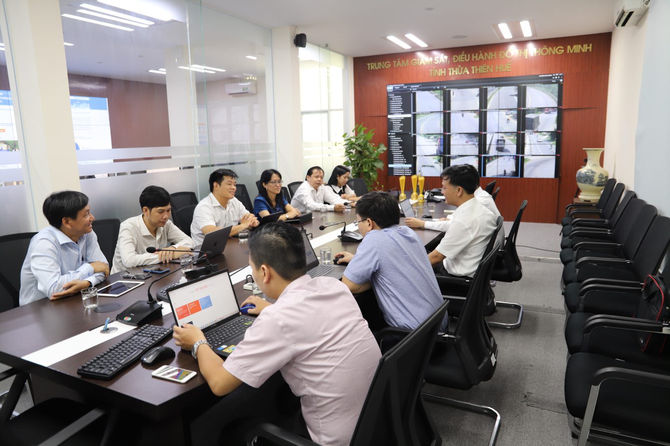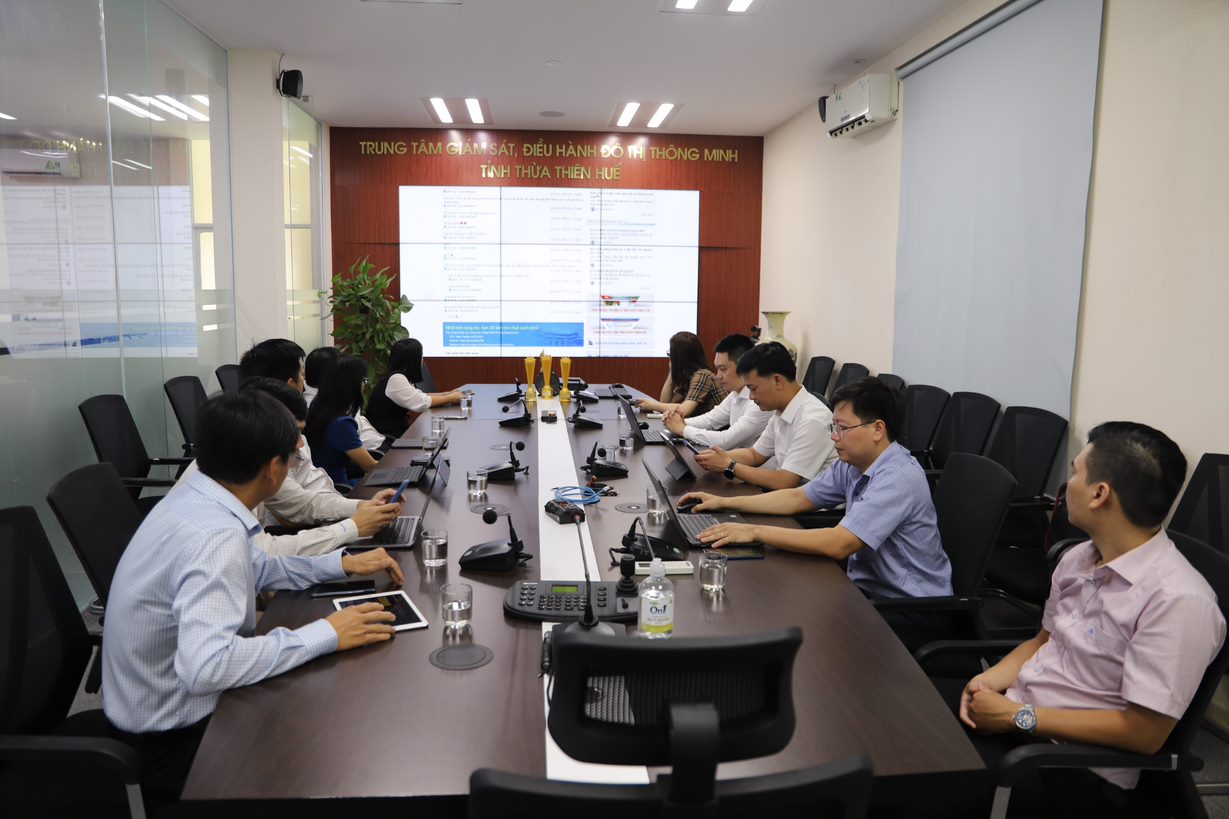 Mở đầu buổi làm việc đoàn công tác đã được nghe đồng chí Bùi Hoàng Minh – Giám đốc Trung tâm IOC giới thiệu về quy trình vận hành cũng như những kết quả đạt được trong việc triển khai các dịch vụ đô thị thông minh, nhất là dịch vụ phản ánh hiện trường, giám sát vi phạm giao thông, giám sát thông tin báo chí, hệ thống tổng đài 19001075 cũng như những kết quả đã đạt được qua 03 năm triển khai và hoạt động của Hue-S.