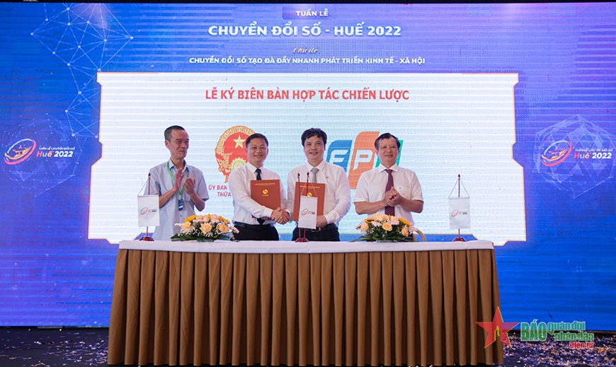 Ngày 18-8, trong khuôn khổ Tuần lễ chuyển đổi số - Huế 2022, Tập đoàn FPT và công ty thành viên đã ký kết hai thỏa thuận hợp tác thúc đẩy chuyển đổi số tỉnh Thừa Thiên Huế đến năm 2025.