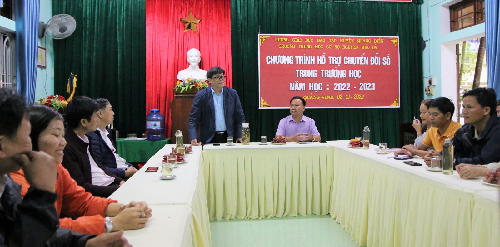 Tại buổi làm việc, TS. Hoàng Bảo Hùng chia sẻ những khó khăn của các trường Tiểu học và THCS, nhất là các trường ở vùng sâu, vùng xa, vùng trũng như Trường THCS Nguyễn Hữu Đà, qua đó tư vấn nhà trường cần có sự nghiên cứu cụ thể để lựa chọn các ứng dụng CNTT phù hợp trong quá trình chuyển đổi số, hỗ trợ giáo viên trong xây dựng giáo án điện tử và quản lý công việc trên môi trường Internet.