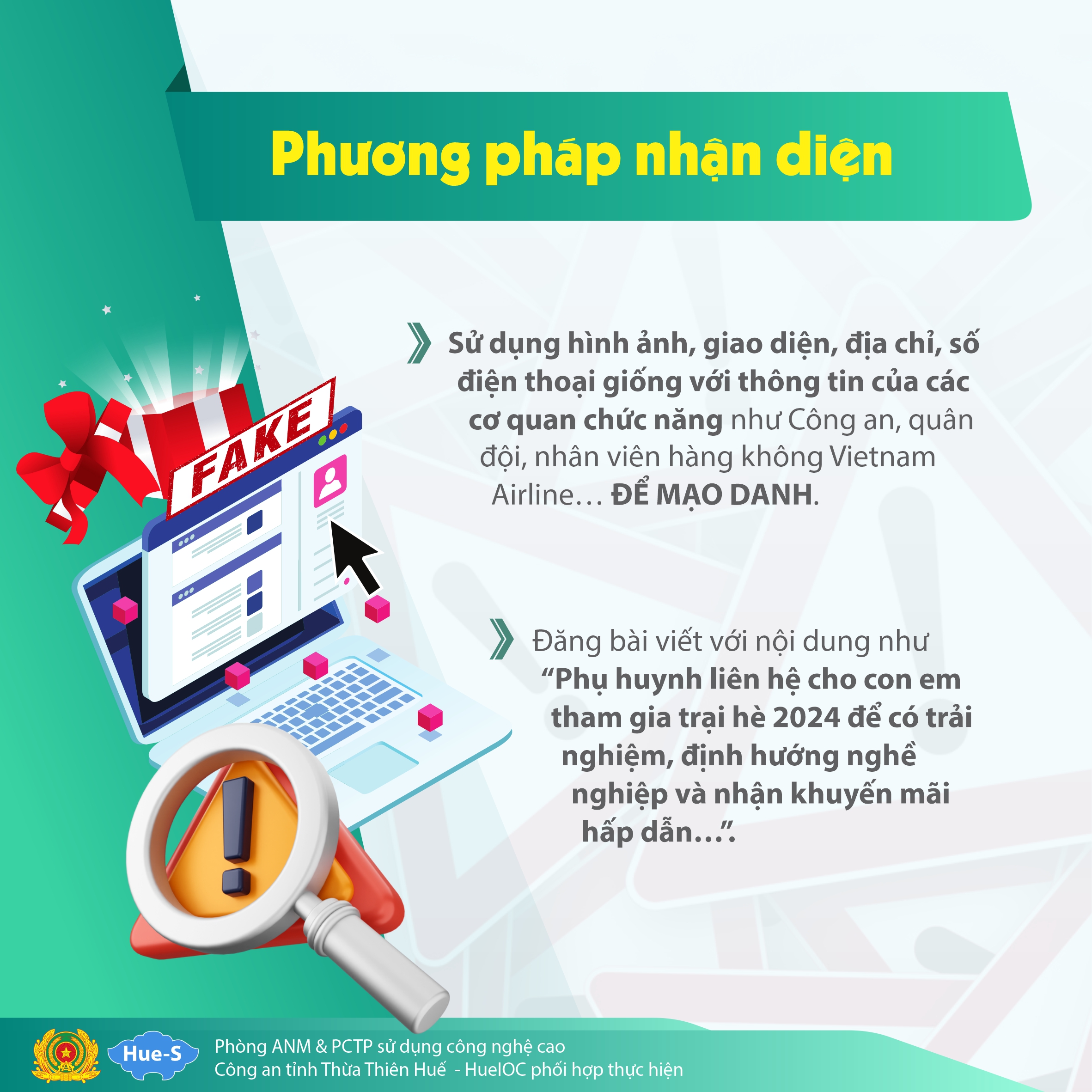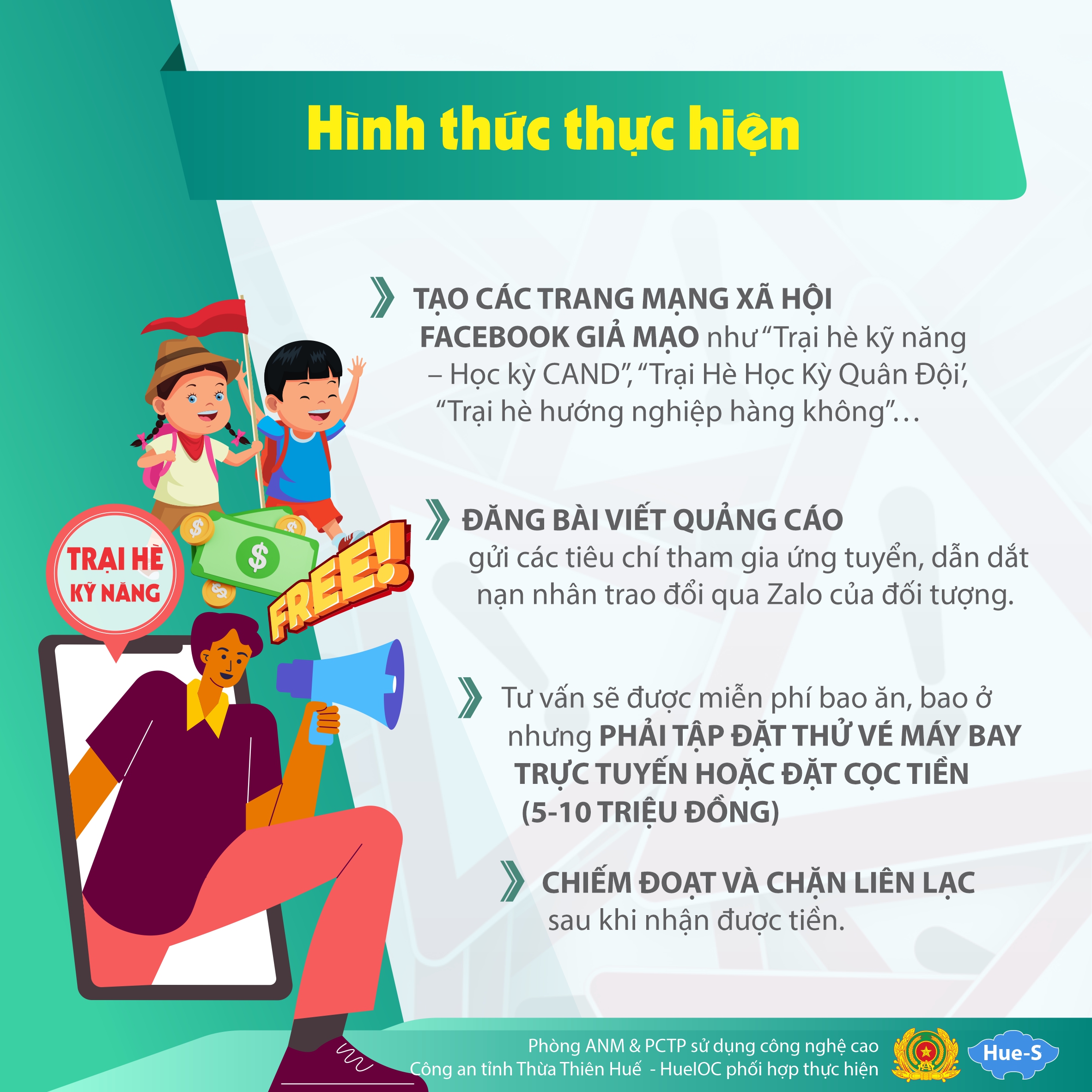 Các đối tượng tạo các trang mạng xã hội Facebook như “Trại hè kỹ năng – Học kỳ CAND”, “Trại Hè Học Kỳ Quân Đội’, “Trại hè hướng nghiệp hàng không”… để đăng bài viết quảng cáo và bán chương trình trải nghiệm các kỹ năng dành cho trẻ em. Khi phụ huynh có nhu cầu liên hệ, các đối tượng gửi tiêu chí tham gia ứng tuyển, mã ứng viên và dẫn dắt phụ huynh trao đổi qua Zalo do đối tượng cung cấp.