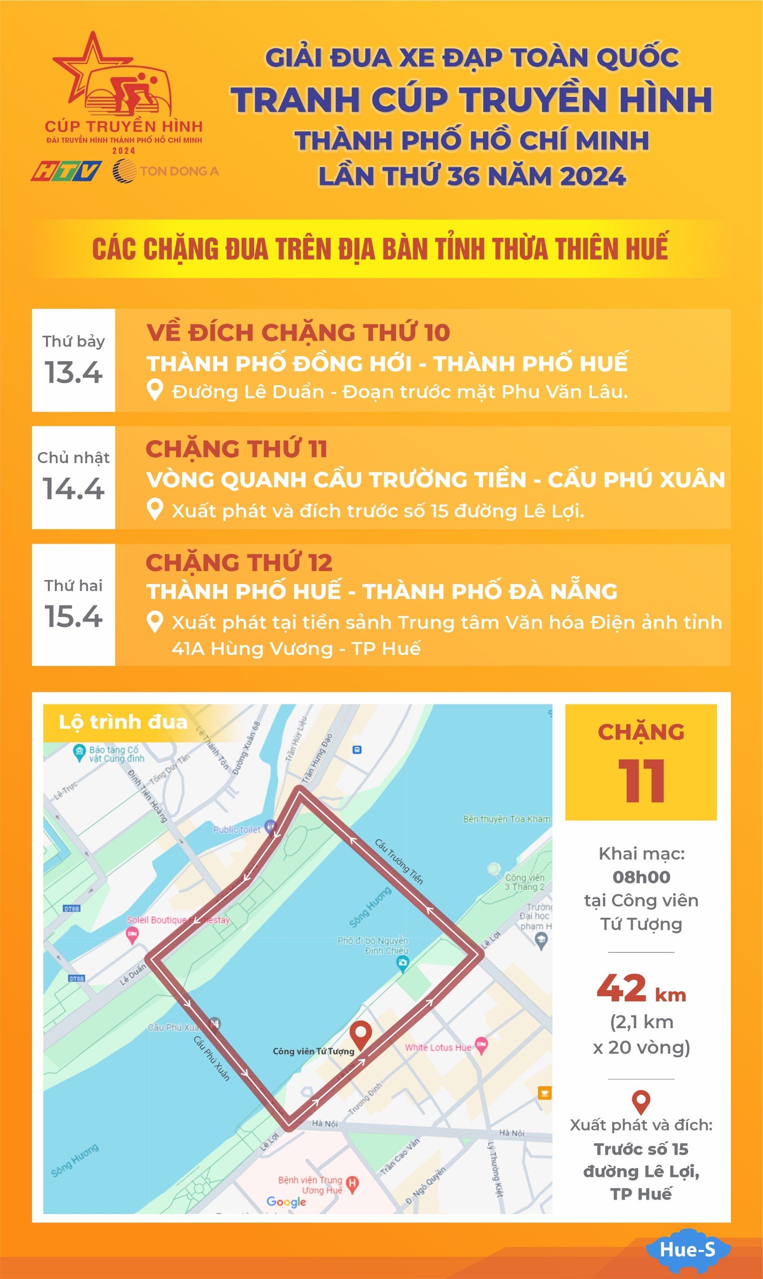 Sau khi về đích chặng thứ 10 (TP. Đồng Hới – TP. Huế) vào trưa ngày 13/4 tại đường Lê Duẩn - Đoạn trước mặt Phu Vân Lâu. Ngày 14/4, các vận động viên sẽ tiếp tục chặng đua 11 với cự ly 42 km vòng quanh cầu Trường Tiền – cầu Phú Xuân; xuất phát và đích trước số 15 đường Lê Lợi, TP. Huế.