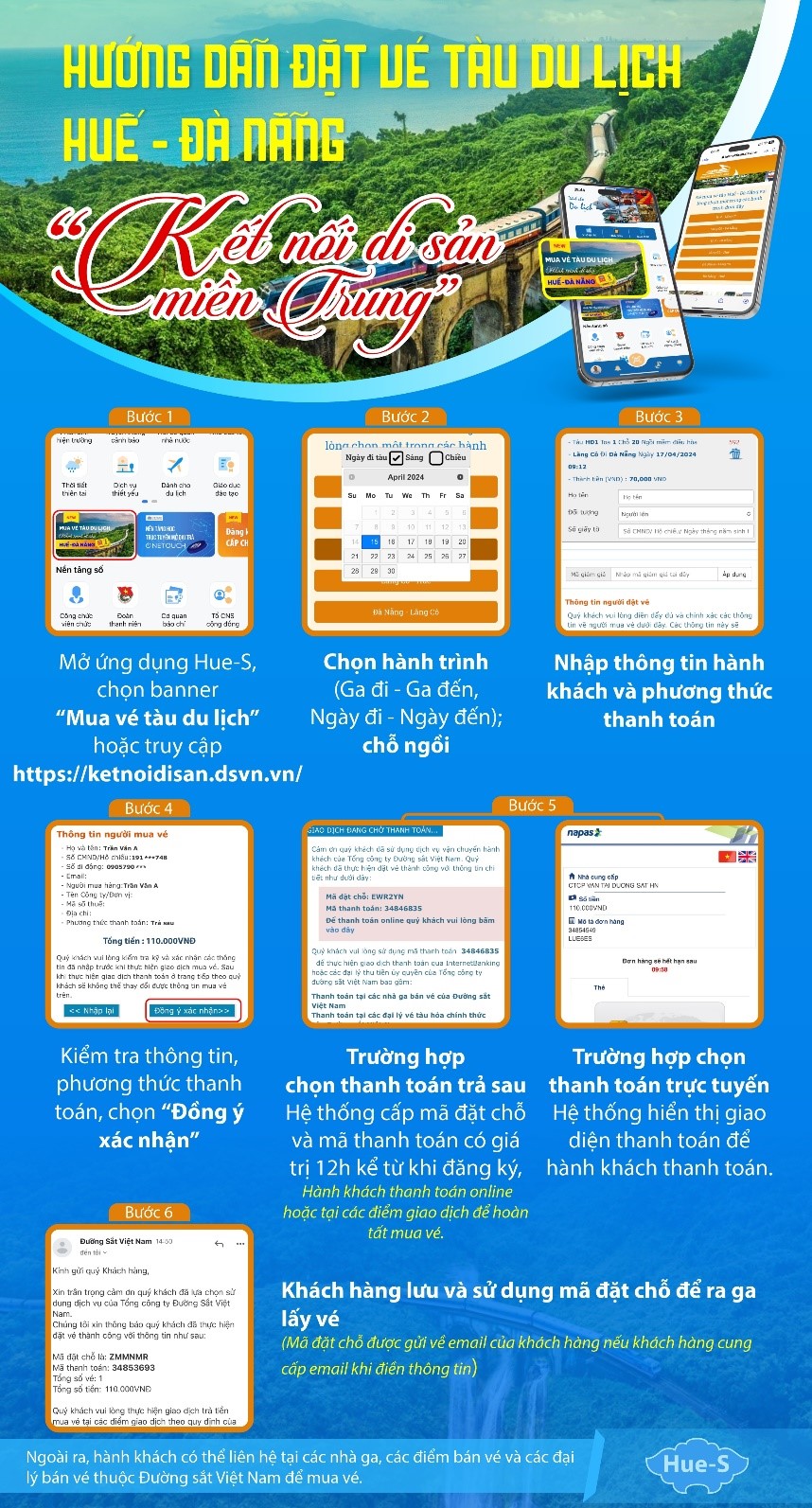 Nhằm tạo thuận tiện cho người dân và du khách có thể dễ dàng mua vé, lựa chọn hành trình và thời gian phù hợp trên đoàn tàu du lịch Huế - Đà Nẵng, Hue-S đã tích hợp chuyên trang Đoàn tàu du lịch Huế - Đà Nẵng “Kết nối di sản miền Trung”.