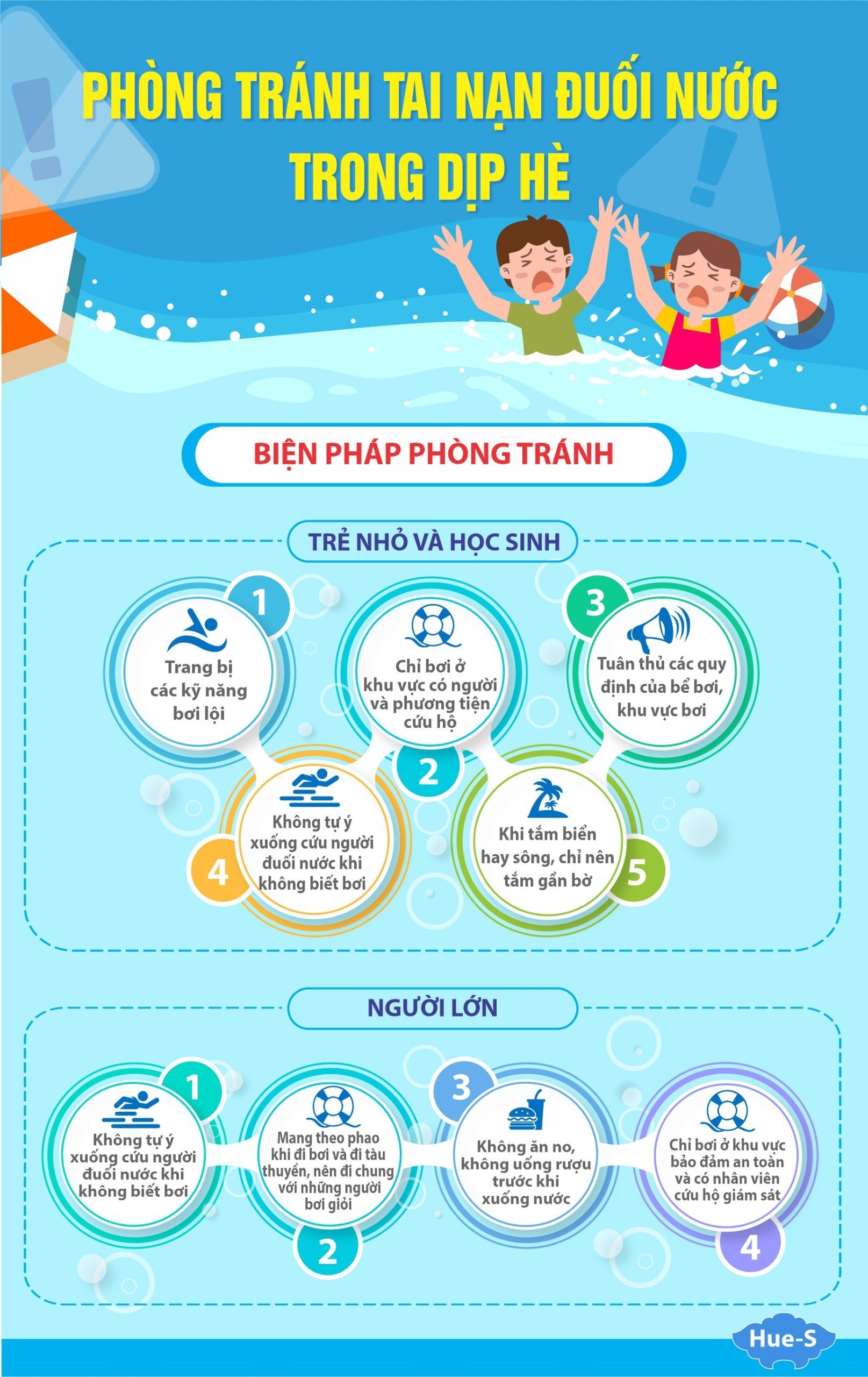 Đối với trẻ nhỏ và học sinh, phụ huynh cần trang bị các kỹ năng bơi lội; khi cho trẻ đi bơi chỉ bơi ở khu vực có người và phương tiện cứu hộ; tuân thủ các quy định của bể bơi, khu vực bơi; không tự ý xuống cứu người đuối nước khi không biết bơi; khi tắm biển hay sông, chỉ nên tắm gần bờ.