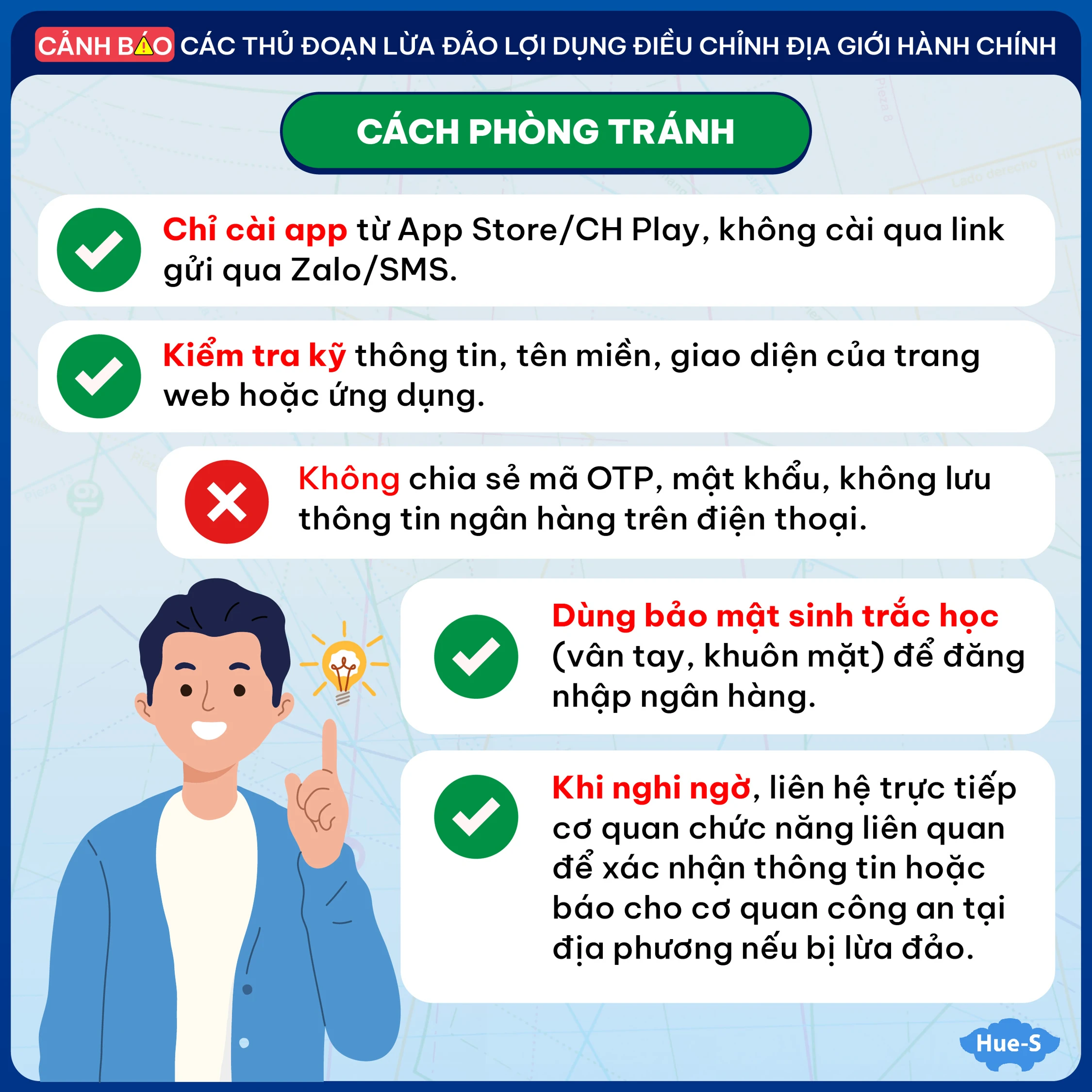 - Tuyệt đối không chia sẻ mã OTP, mật khẩu, thông tin tài khoản ngân hàng; hạn chế lưu trữ thông tin ngân hàng trên điện thoại di động.