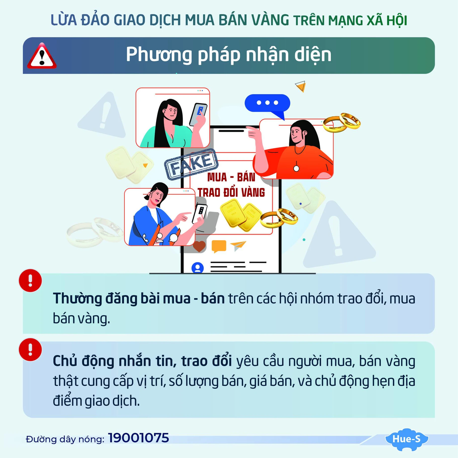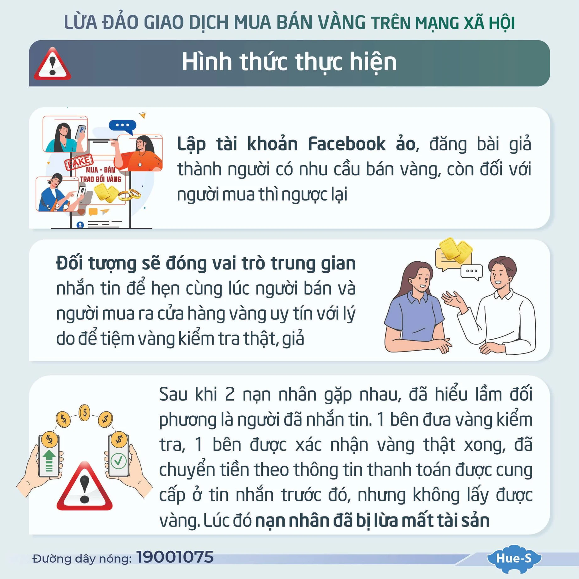Các đối tượng tạo lập tài khoản mạng xã hội ảo, đăng bài giả làm người có nhu cầu bán vàng; đối với người bán thật, chúng lại đóng vai người mua vàng với giá hấp dẫn.