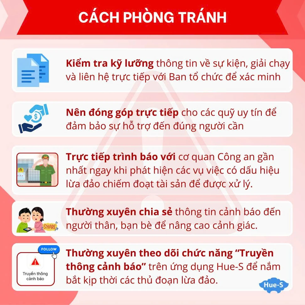 - Thường xuyên theo dõi chức năng “Truyền thông cảnh báo” trên ứng dụng Hue-S để nắm bắt kịp thời các thủ đoạn lừa đảo.