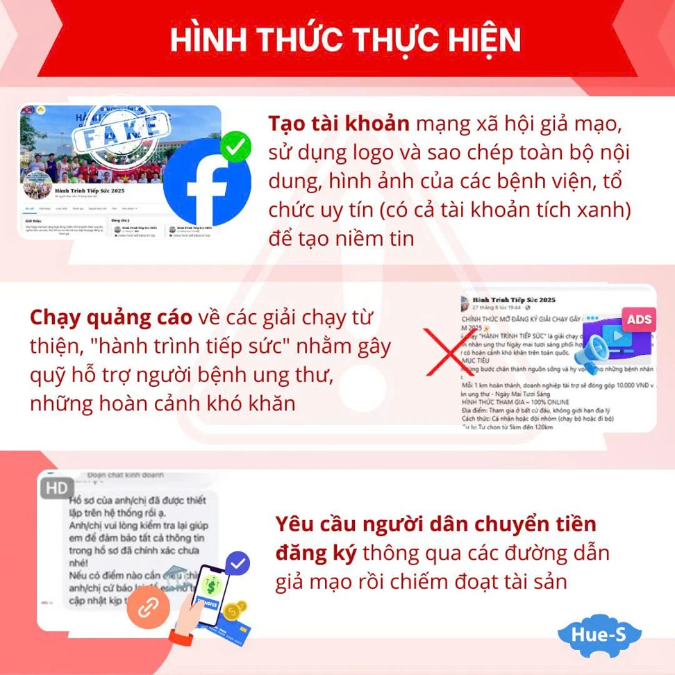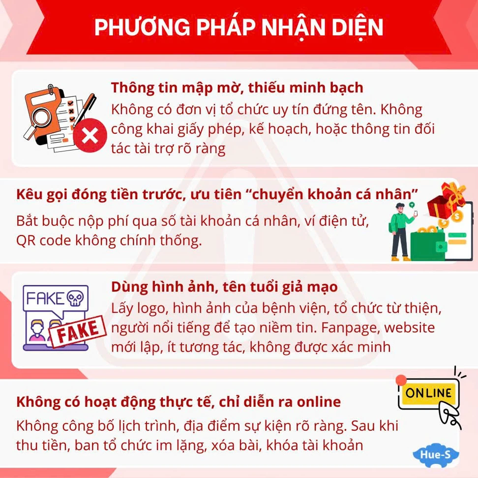 - Thông tin mập mờ, thiếu minh bạch. Không có đơn vị tổ chức uy tín đứng tên (Hội, Liên đoàn, UBND, Quỹ chính thức). Không công khai giấy phép, kế hoạch, hoặc thông tin đối tác tài trợ rõ ràng.