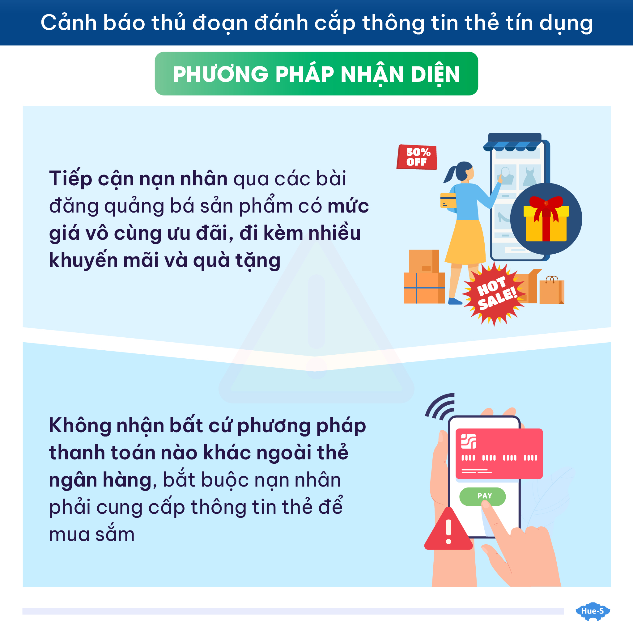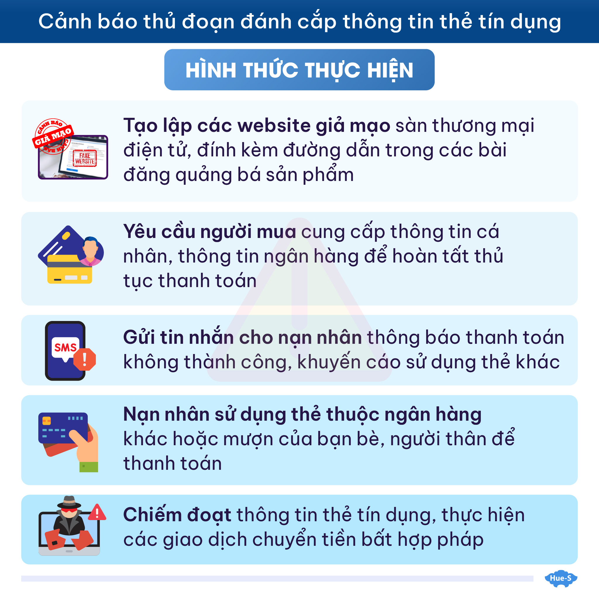 Các đối tượng tạo lập các website giả mạo sàn thương mại điện tử, đính kèm đường dẫn trong các bài đăng quảng bá sản phẩm. Người có nhu cầu mua sắm sẽ phải cung cấp thông tin cá nhân, thông tin ngân hàng để hoàn tất thủ tục thanh toán. Tuy nhiên, sau khi điền thông tin, các đối tượng gửi tin nhắn cho nạn nhân thông báo phương thức thanh toán không thành công do thẻ bị từ chối, khuyến cáo nạn nhân thử lại bằng cách sử dụng thẻ khác.