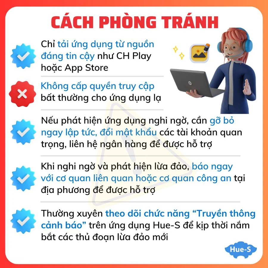 - Thường xuyên theo dõi chức năng “Truyền thông cảnh báo” trên ứng dụng Hue-S để kịp thời nắm bắt các thủ đoạn lừa đảo mới.