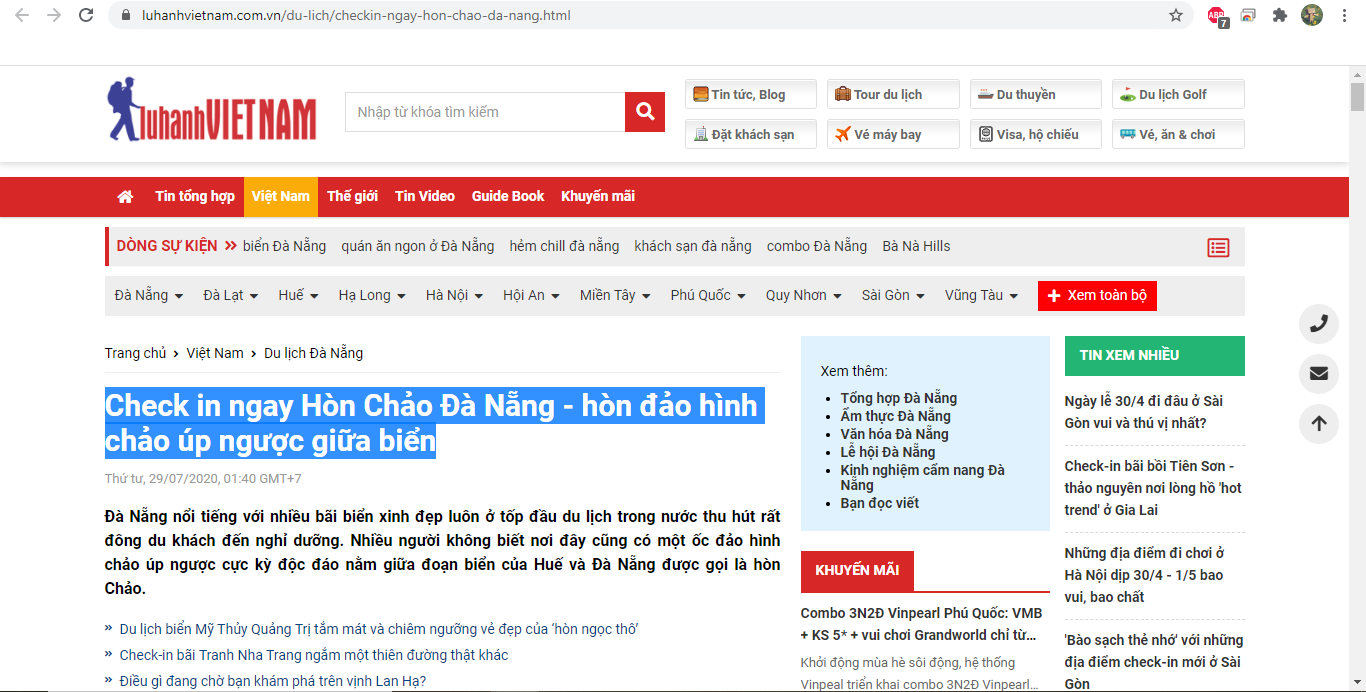 Trung tâm Giám sát điều hành đô thị thôn minh nhận được phản ánh của người dân về việc website https://luhanhvietnam.com.vn có đăng tải bài viết có nội dung "Check in ngay Hòn Chảo Đà Nẵng - hòn đảo hình chảo úp ngược giữa biển" tại đường link: https://luhanhvietnam.com.vn/du-lich/checkin-ngay-hon-chao-da-nang.html. Trong đó có rất nhiều điểm khẳng định địa danh Hòn Chảo trực thuộc Đà Nẵng, gây ảnh hưởng đến uy tín và du lịch của Tỉnh Thừa Thiên Huế.