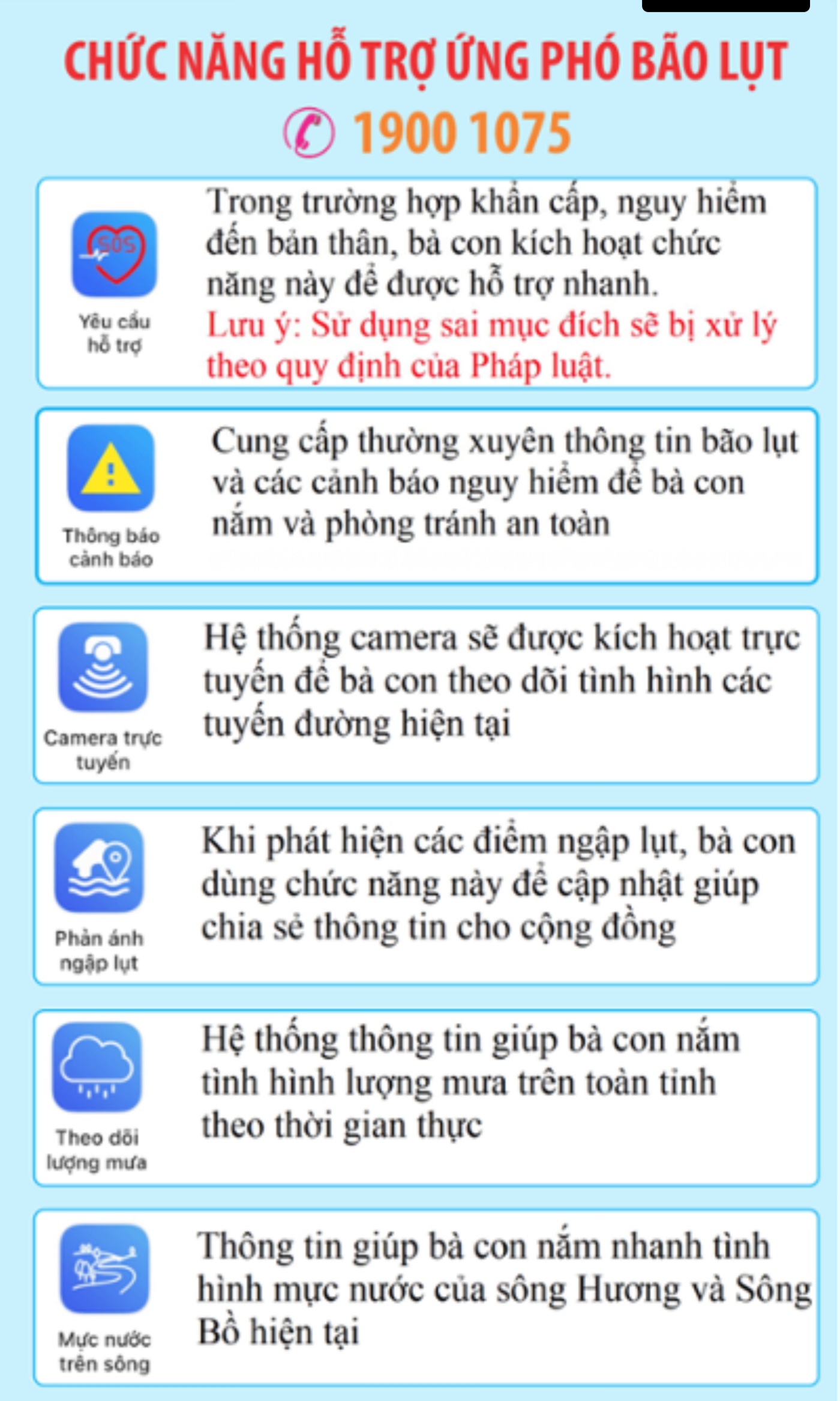“Thông báo cảnh báo”: Cung cấp thường xuyên thông tin bão lụt và cảnh báo nguy hiểm để người dân nắm và phòng tránh an toàn.