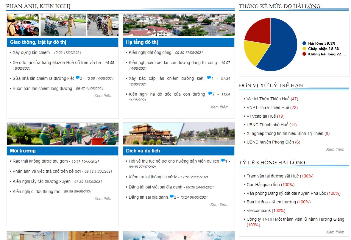 Tuy nhiên, cũng còn tồn tại một số hạn chế trong công tác phản ánh hiện trường như một số địa phương, cơ quan còn chậm xử lý các phản ánh của người dân, có 1.23% tổng số phản ánh quá hạn xử lý. Để khắc phục điều này, ngoài việc đề nghị các địa phương tích cực tham gia vào hệ thống phản ánh hiện trường, đồng thời tập huấn cho các bộ tiếp nhận thông tin được thao tác nhuần nhuyễn. Bên cạnh đó, Trung tâm Giám sát, điều hành đô thị thông minh cán bộ tiếp nhận thông qua hệ thống thường xuyên nhắc nhở các địa phương để kịp thời gian phản ánh thông qua email, điện thoại từ tổng đài. Hàng tuần Trung tâm IOC gửi báo cáo những đơn vị chậm trong việc xử lý phản ánh hiện trường đến UBND tỉnh để chỉ đạo các đơn vị thực hiện. Đồng thời, chỉ tiêu về xử lý đúng hạn phản ánh hiện trường và mức độ hài lòng của người dân là số điểm đánh giá tiêu chí xét thi đua, khen thưởng của các đơn vị hàng năm, đã được quy định Quyết định số 43/2020/QĐ-UBND ngày 04/8/2020 về Quy định triển khai hệ thống thông tin phản ánh hiện trường trên địa bàn tỉnh Thừa Thiên Huế.