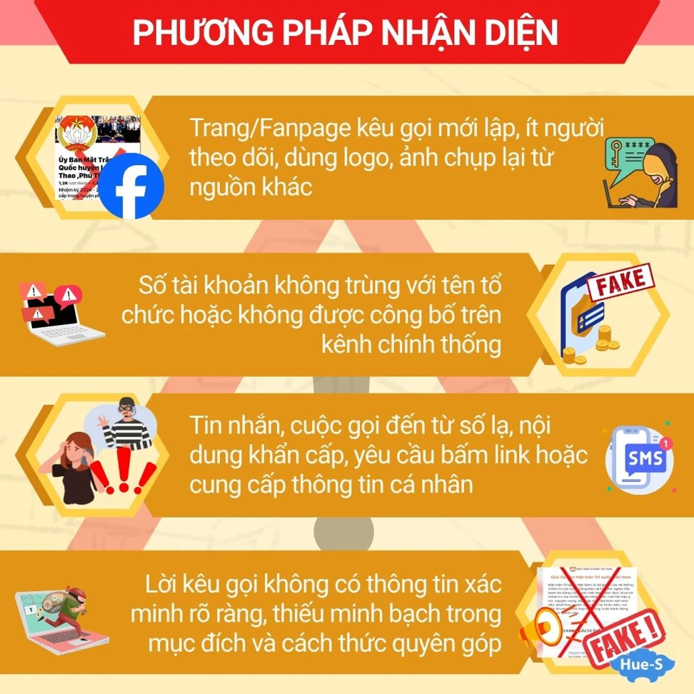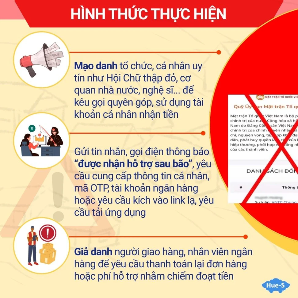 - Mạo danh các tổ chức, cá nhân uy tín như Hội Chữ thập đỏ, cơ quan nhà nước, chính quyền địa phương, nghệ sĩ, người nổi tiếng… để kêu gọi quyên góp, cứu trợ; sử dụng tài khoản cá nhân hoặc tài khoản không rõ nguồn gốc để nhận tiền ủng hộ.