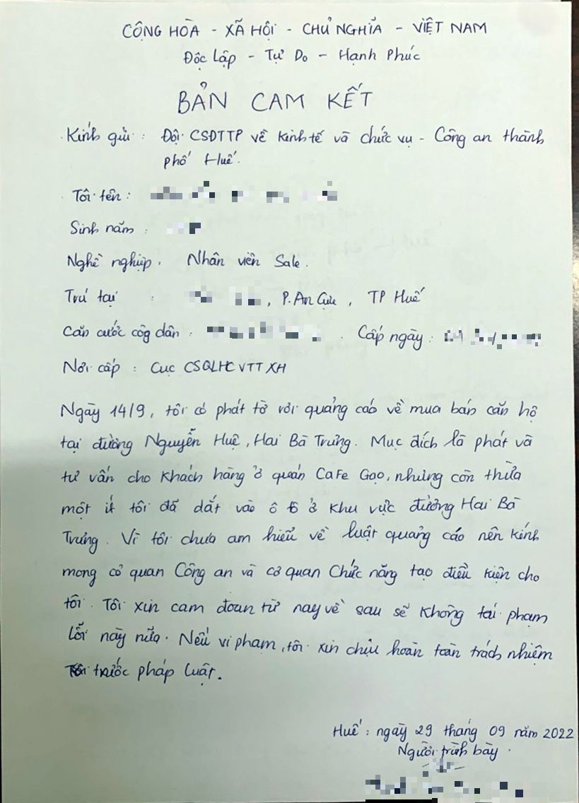 Bản cam kết của người vi phạm (Ảnh: hue-S)