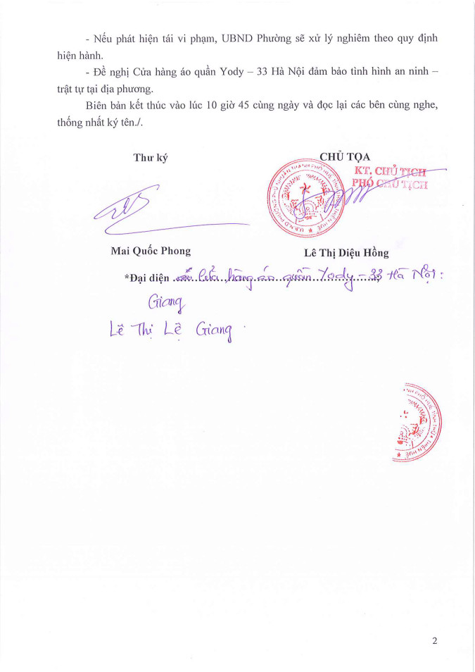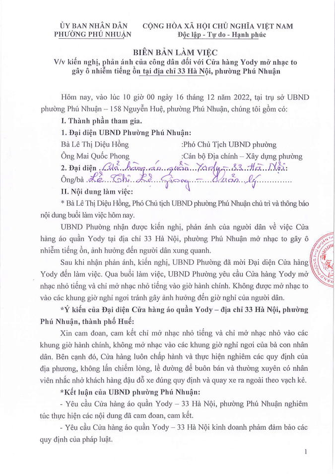 Nhận được thông tin phản ánh, UBND phường Phú Nhuận đã tiến hành mời Đại diện cửa hàng áo quần Yody đến trụ sở UBND phường Phú Nhuận để làm việc. Tại buổi làm việc, UBND phường yêu cầu đại diện cửa hàng áo quần Yody – 33 Hà Nội, phường Phú Nhuận nghiêm túc thực hiện các nội dung đã cam đoan, cam kết; kinh doanh phải chấp hành các quy định của pháp luật. Nếu phát hiện tái vi phạm, UBND phường sẽ xử lý nghiêm theo quy định hiện hành. Đồng thời, đề nghị cửa hàng đảm bảo tình hình an ninh – trật tự tại địa phương. Đại diện cửa hàng áo quần Yody - 33 Hà Nội đã cam đoan, cam kết chỉ mở nhạc với âm lượng đúng quy định pháp luật cho phép. Bên cạnh đó, công ty luôn chấp hành và thực hiện nghiêm các quy định của địa phương, không lấn chiếm lòng, lề đường để buôn bán và thường xuyên có nhân viên nhắc nhở khách hàng đậu đỗ xe đúng quy định và quay xe ra ngoài theo vạch kẻ.