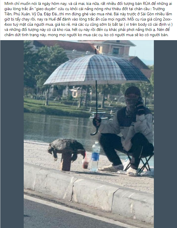 Theo phản ánh của người dân qua Hue-S, một nam thanh niên bịt mặt, tay cầm ô ngồi ngay lề đường để rao bán một con rùa được đặt trên viên gạch giữa trời nắng nóng. Tình trạng này đã tái diễn rất nhiều, đã có người mua phóng sanh, Công an cũng đã từng xử lý nhưng đến nay vẫn chưa xử lý triệt để.