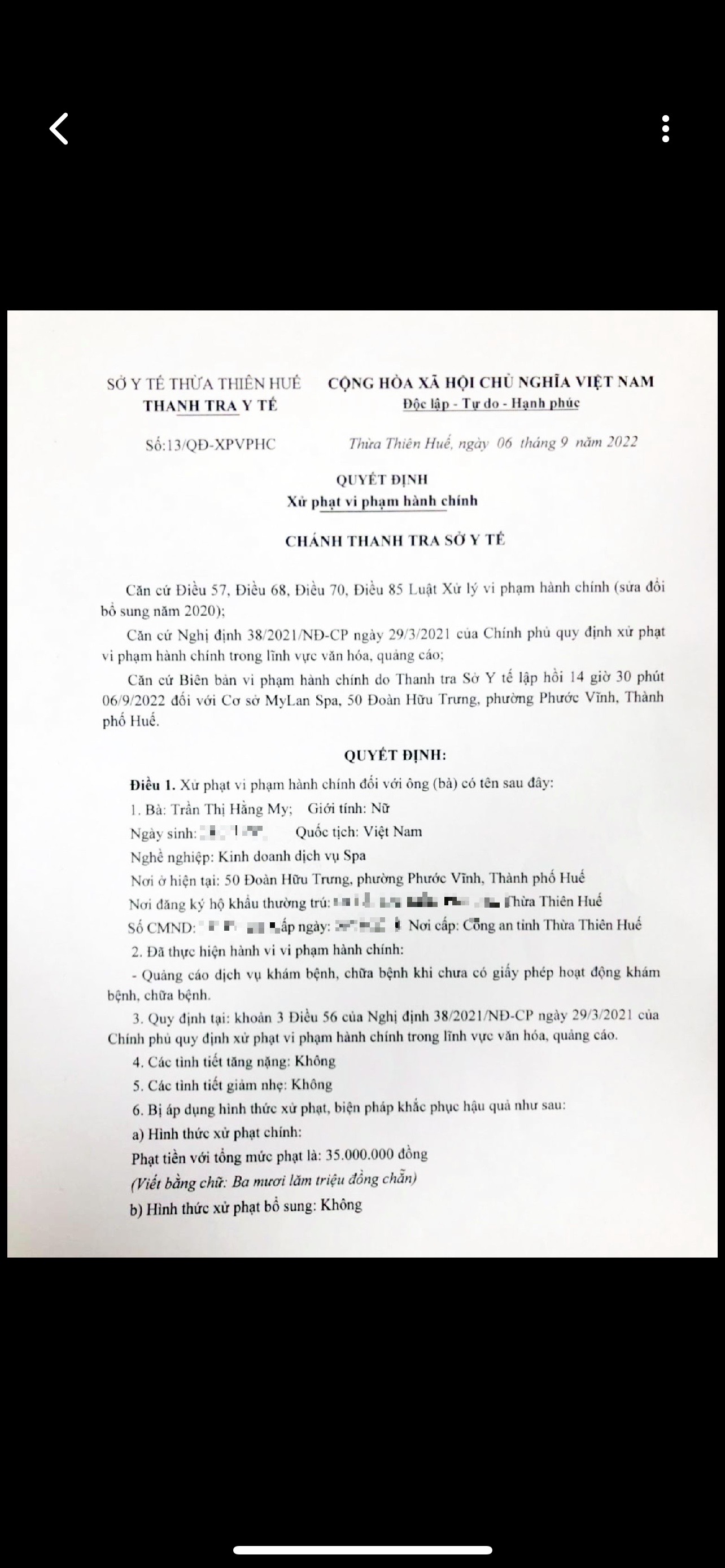 Ngày 13/9/2022, Sở Y tế nhận được thông tin phản ánh của người dân với nội dung: Cơ sở MyLan Spa tiếp tục quảng cáo phẫu thuật thẩm mỹ thông qua phản ánh hiện trường trên ứng dụng Hue- S. Ngày 15/9/2022, Sở Y tế đã phối hợp với Phòng Y tế Thành phố và Trạm Y tế phường Phước Vĩnh tiến hành kiểm tra cơ sở theo phản ánh. Sau kiểm tra, nhận thấy cơ sở có hành vi tái diễn vi phạm, Thanh tra Sở Y tế đã lập biên bản vi phạm, ban hành quyết định xử phạt vi phạm hành chính với số tiền 45.000.000 đồng (bốn mươi lăm triệu đồng) và đình chỉ hoạt động của cơ sở trong thời hạn 18 tháng đối với cơ sở MyLan Spa (địa chỉ 50 Đoàn Hữu Trưng, phường Phước Vĩnh, TP Huế). Cơ sở này đã thực hiện hành vi vi phạm cung cấp dịch vụ thẩm mỹ tại cơ sở dịch vụ thẩm mỹ khi chưa có văn bản thông báo đáp ứng đủ điều kiện cung cấp dịch vụ thẩm mỹ gửi về cơ quan nhà nước có thẩm quyền theo quy định của pháp luật trong lĩnh vực Y tế.