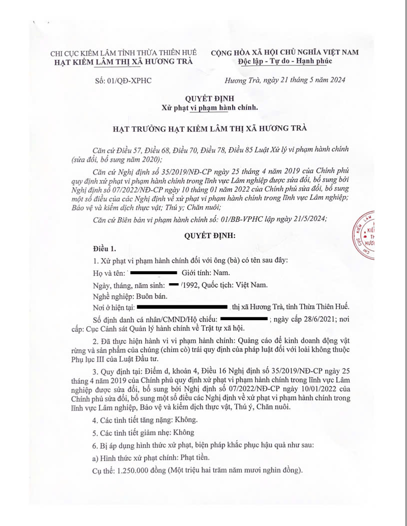 Hạt Kiểm lâm thị xã Hương Trà đã tiến hành lập biên bản vi phạm hành chính đối với ông Tr.H.B về hành vi quảng cáo để kinh doanh động vật rừng và sản phẩm của chúng (chim cò) trái quy định của pháp luật đối với loài không thuộc Phụ lục III của Luật Đầu tư được quy định tại điểm d, khoản 4, Điều 16 Nghị định số 35/2019/NĐ-CP ngày 25/4/2019 của Chính phủ quy định xử phạt vi phạm hành chính trong lĩnh vực Lâm nghiệp (được sửa đổi bổ sung bởi Nghị định số 07/2022/NĐ-CP ngày 10/01/2022 của Chính phủ). Với hành vi vi phạm nêu trên, cùng ngày Hạt Kiểm lâm thị xã Hương Trà đã ra Quyết định xử phạt vi phạm hành chính đối với ông Tr.H.B với số tiền phạt là 1.250.000 đồng. Hiện cá nhân vi phạm đã chấp hành Quyết định xử phạt.