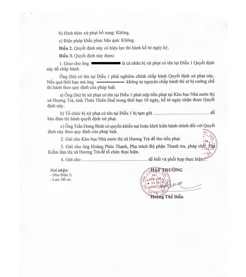 Tại thời điểm kiểm tra không phát hiện hành vi tàng trữ lâm sản trái pháp luật. Với hành vi vi phạm nêu trên, cùng ngày Hạt Kiểm lâm thị xã Hương Trà đã ra Quyết định xử phạt vi phạm hành chính đối với ông Ng.K.T với số tiền phạt là 1.250.000 đồng. Hiện cá nhân vi phạm đã chấp hành Quyết định xử phạt.