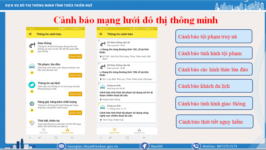 Trong trường hợp cần thông báo cho người dân, xã hội những cảnh báo hoặc truyền thông, cơ quan chuyên môn sẽ thông qua hệ thống thông tin dịch vụ đô thị thông minh tiến hành nhập dữ liệu và các điều kiện cảnh báo. Tất cả các cảnh báo từ các cơ quan chuyên môn sẽ được thông báo rộng rãi thông qua ứng dụng Hue-S. Ngoài ra, hệ thống cũng hỗ trợ cho người dân và xã hội cung cấp thông tin cảnh báo cho Trung tâm IOC thông qua ứng dụng Hue-S.