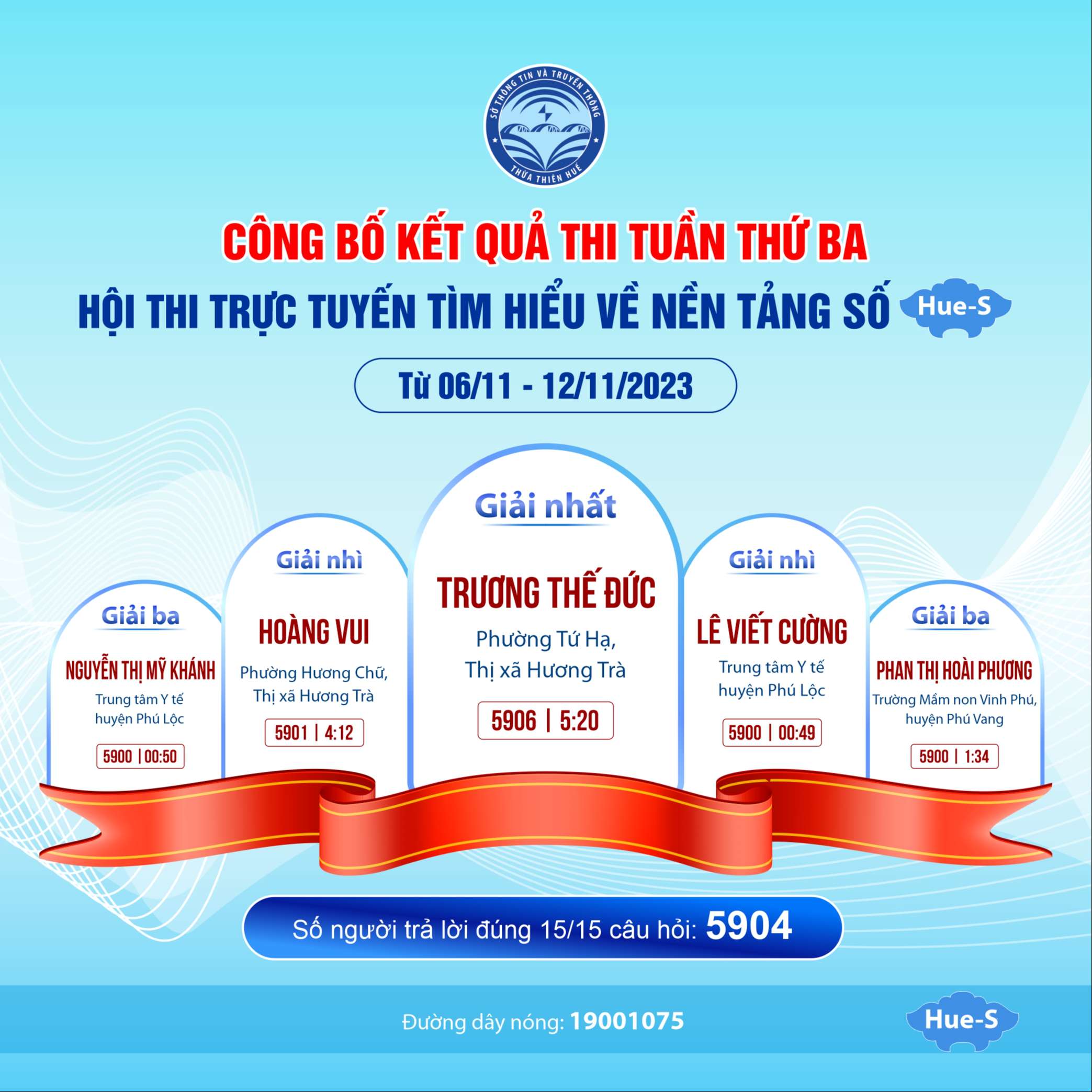 Đợt thi tuần thứ ba diễn ra từ ngày 06/11 đến hết ngày 12/11/2023 đã thu hút 9.190 thí sinh tham gia dự thi bao gồm các đối tượng công chức, viên chức, đoàn thanh niên (thuộc 586 cơ quan, đơn vị) và người dân trên toàn tỉnh tham gia dự thi. Trong đó, có 5.904 thí sinh trả lời đúng tất cả 15 câu hỏi do Ban tổ chức đặt ra.